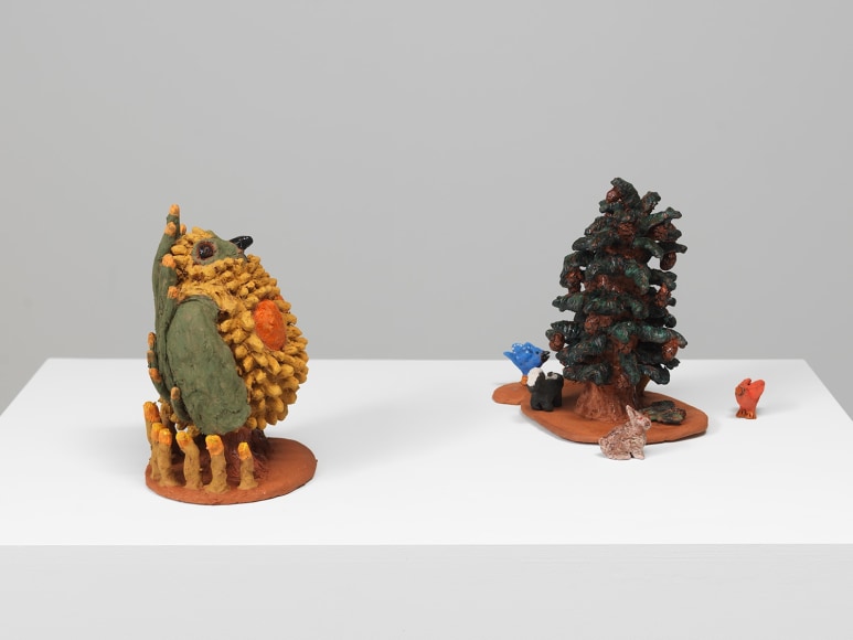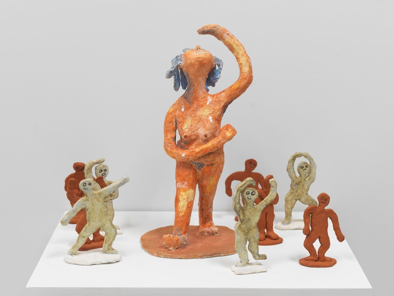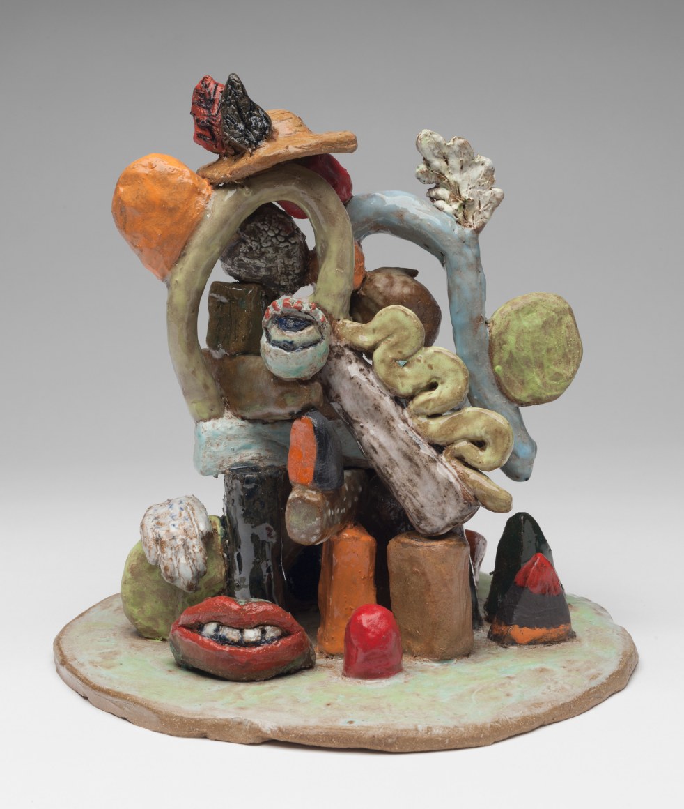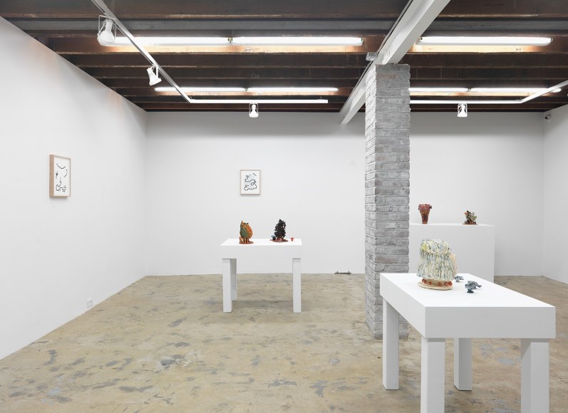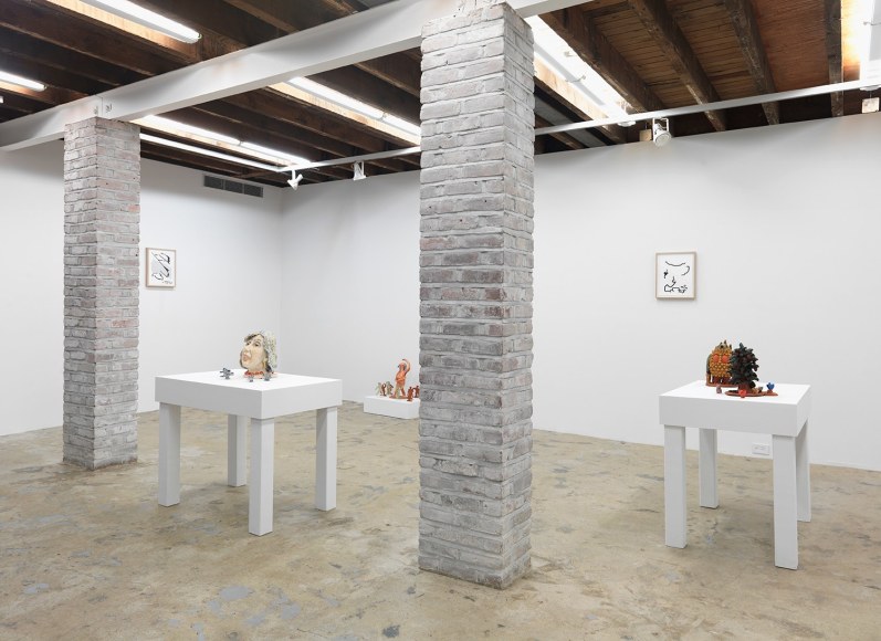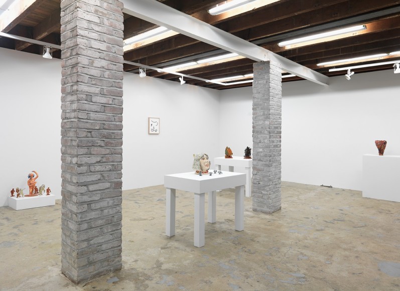 Takeshi Murata’s drawings, which are unique silkscreen prints, distill the artist’s complex and recently photo-realistic vocabulary, to a fairly savage and comical language of expressive glyphs. Equally mysterious are Michelle Segre’s totems made from bread. There’s a good deal of humor and wonder in these objects, which ask to be contemplated and enjoyed with a sense of worship. Finally, Sally Saul’s ceramic sculptures in the downstairs gallery, are wise and crookedly funny works that anchor the exhibition in musings about nature, wildlife, through her dancing figures and surrealist experimentations. Arriving at Saul’s tables brings me back around, grounded again, nicely at home.