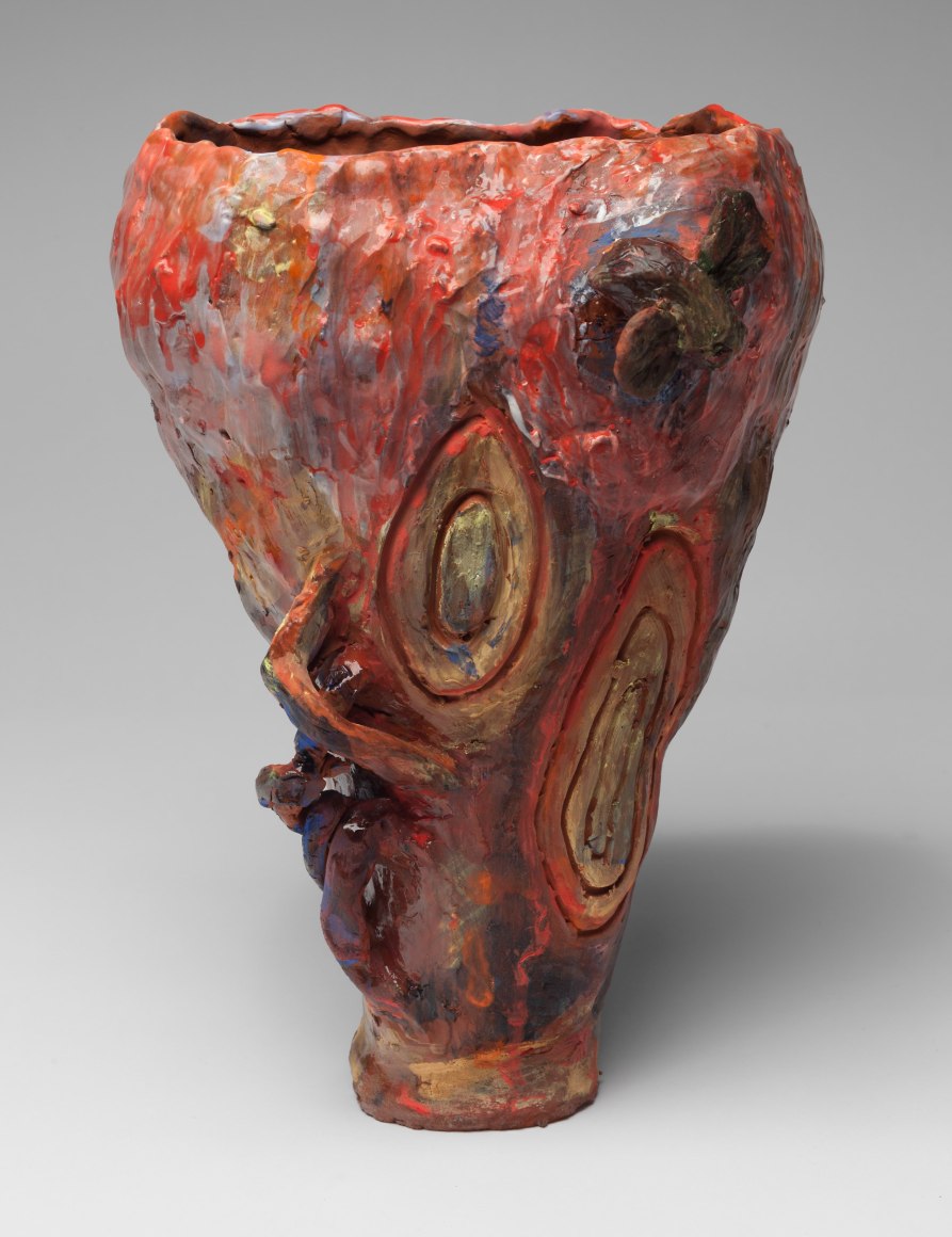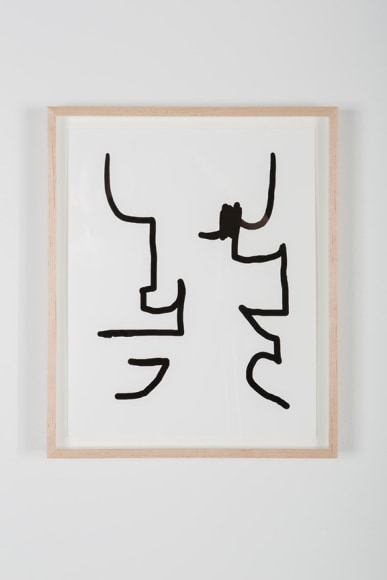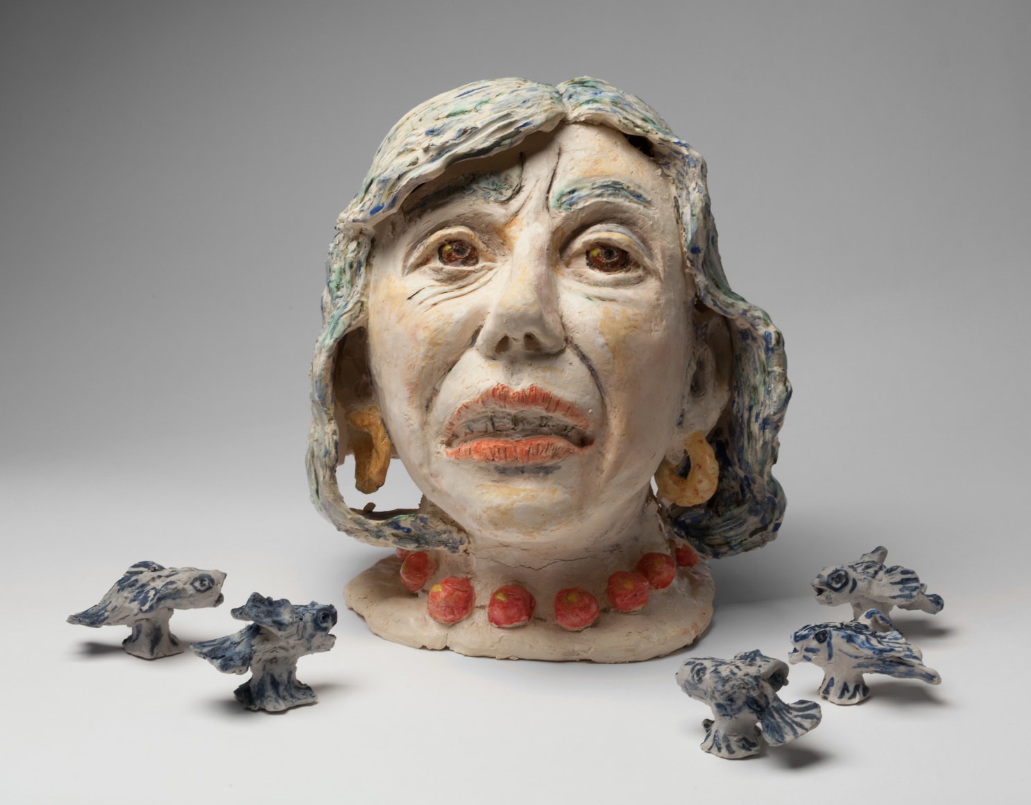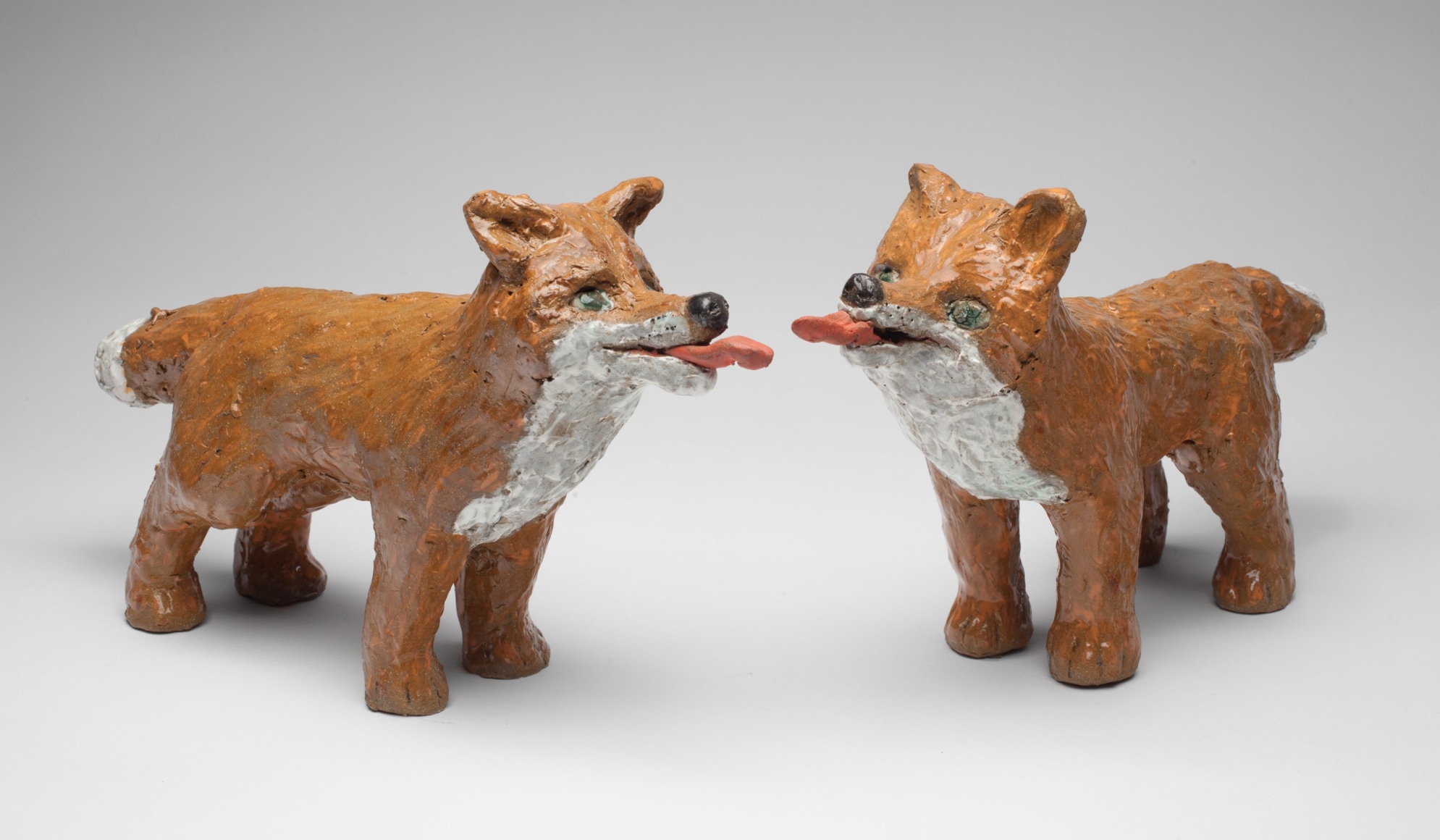 Takeshi Murata’s drawings, which are unique silkscreen prints, distill the artist’s complex and recently photo-realistic vocabulary, to a fairly savage and comical language of expressive glyphs. Equally mysterious are Michelle Segre’s totems made from bread. There’s a good deal of humor and wonder in these objects, which ask to be contemplated and enjoyed with a sense of worship. Finally, Sally Saul’s ceramic sculptures in the downstairs gallery, are wise and crookedly funny works that anchor the exhibition in musings about nature, wildlife, through her dancing figures and surrealist experimentations. Arriving at Saul’s tables brings me back around, grounded again, nicely at home.