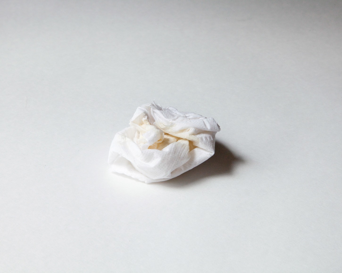 Large grids of objects have been separated into categories, either by type or color, and are spread out, subtly implying the person who owns them. Grids of color swatches ranging from black, to blue, to red, to white clothing alongside hundreds of photographs of objects like: razorblades, soap, suspenders, coffee mugs, shoes, and so on. In a second grid of individually framed images, Heldebro shows a selection of tissues containing bodily fluid which she has collected from her husband over the past year, each one meticulously weighed, photographed and dated. Although dry, hardened and yellowed over time the tissues appear soft, in origami-like shapes in the photographs, uncomfortable symbols of her frustrated desire both to possess Leon but also for a keepsake that is as close to her husband's physical essence as she is able to get.