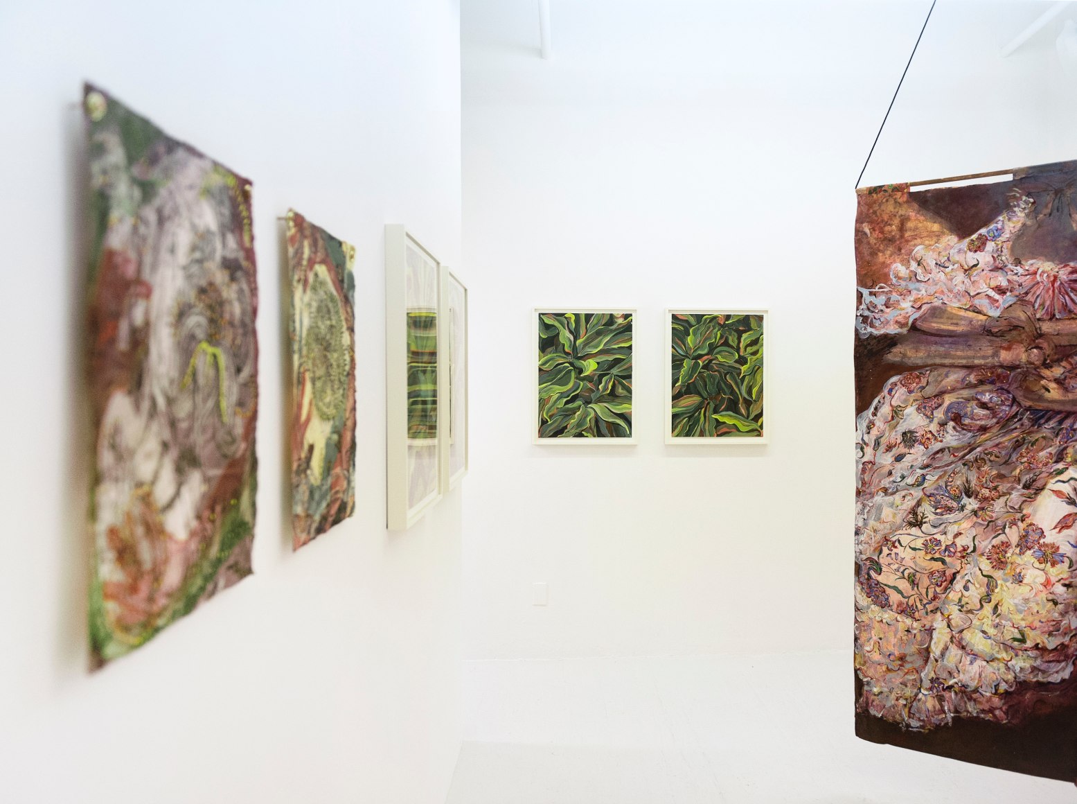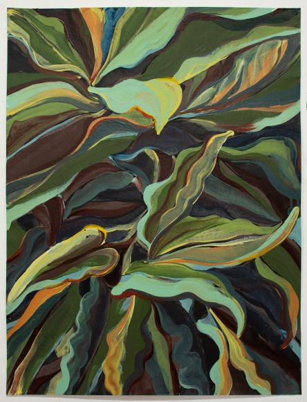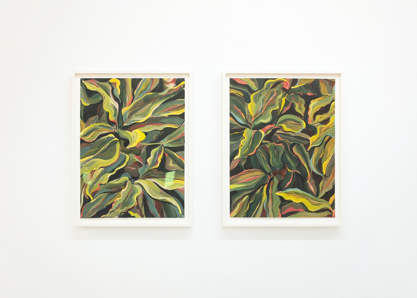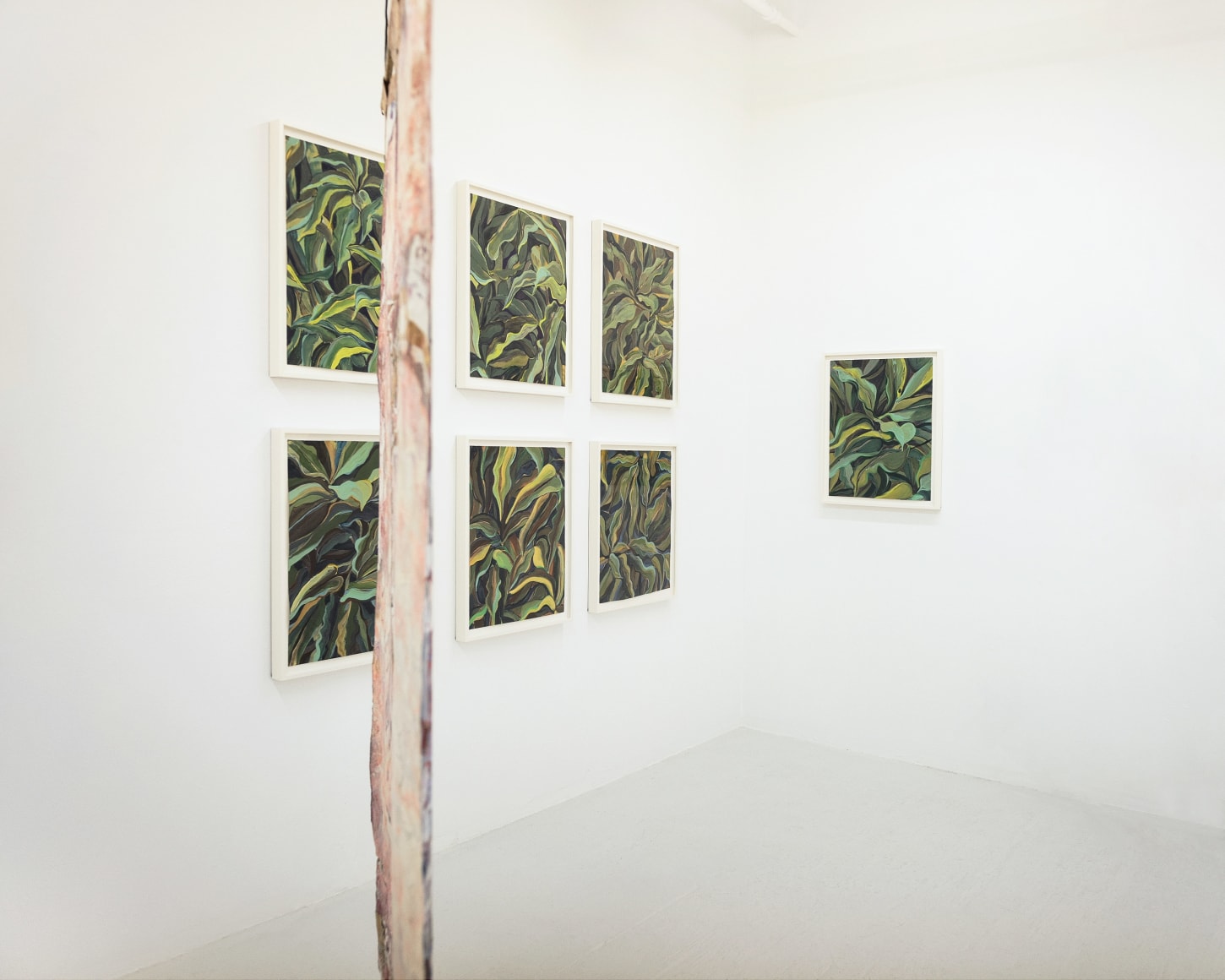 Included in this show are eleven paintings on handmade Bangladeshi Jute paper that present close-cropped views of an old mango tree that lives in Dhaka, Bangladesh. Through the study of personal photographs and her own memory of living with this tree, Hasan presents an abundance of form layered with saturated color, where a sense of environment collapses into healing animated touch. The repeating compositions acknowledge how Hasan engages with memory as a process of the mind, that remembers and imagines simultaneously, where the past is constructed within the present and future.