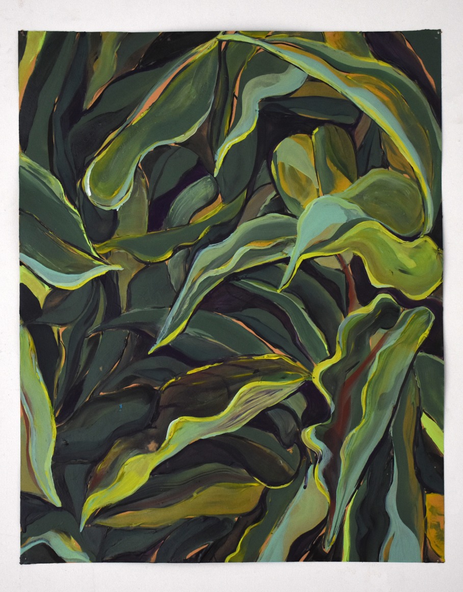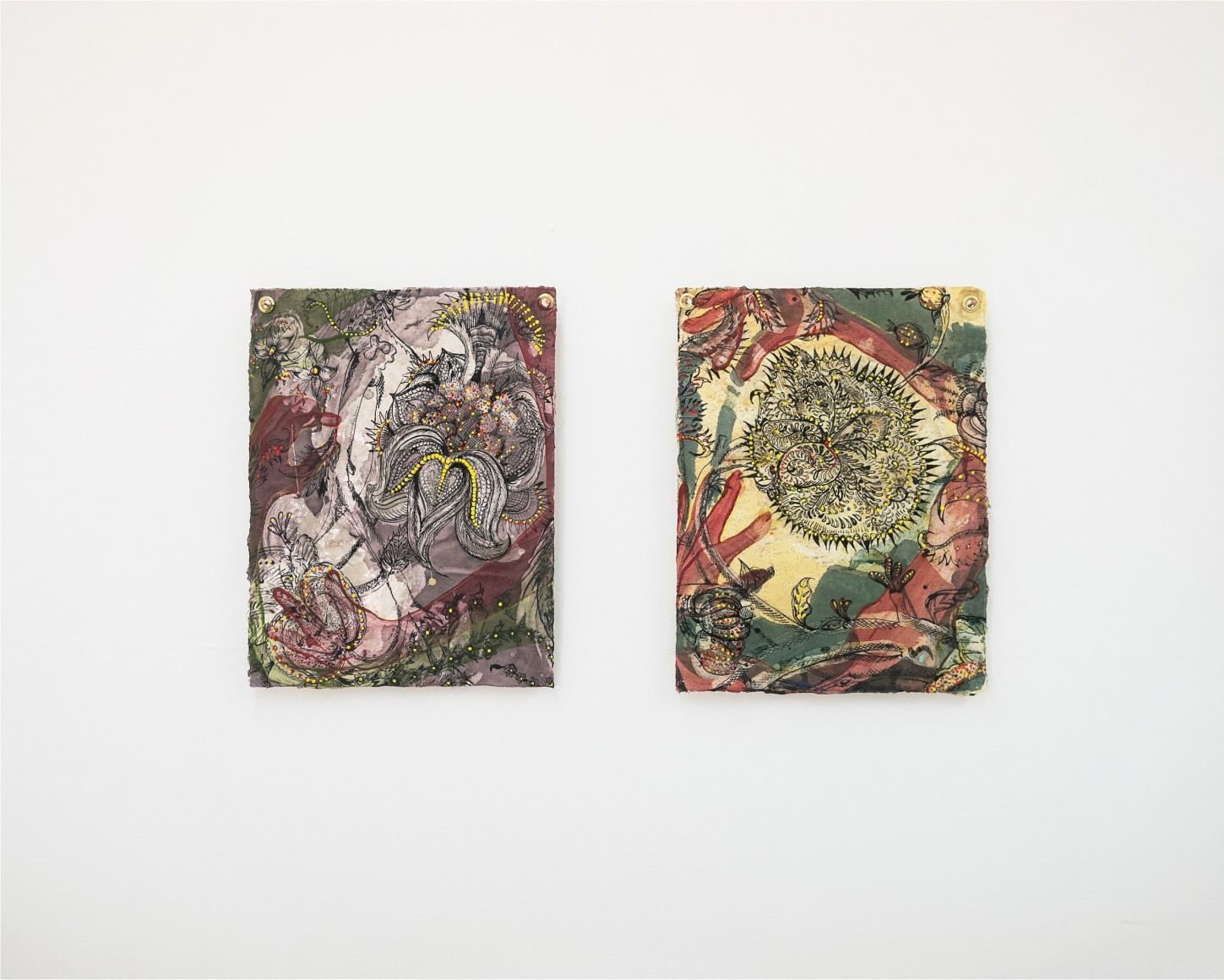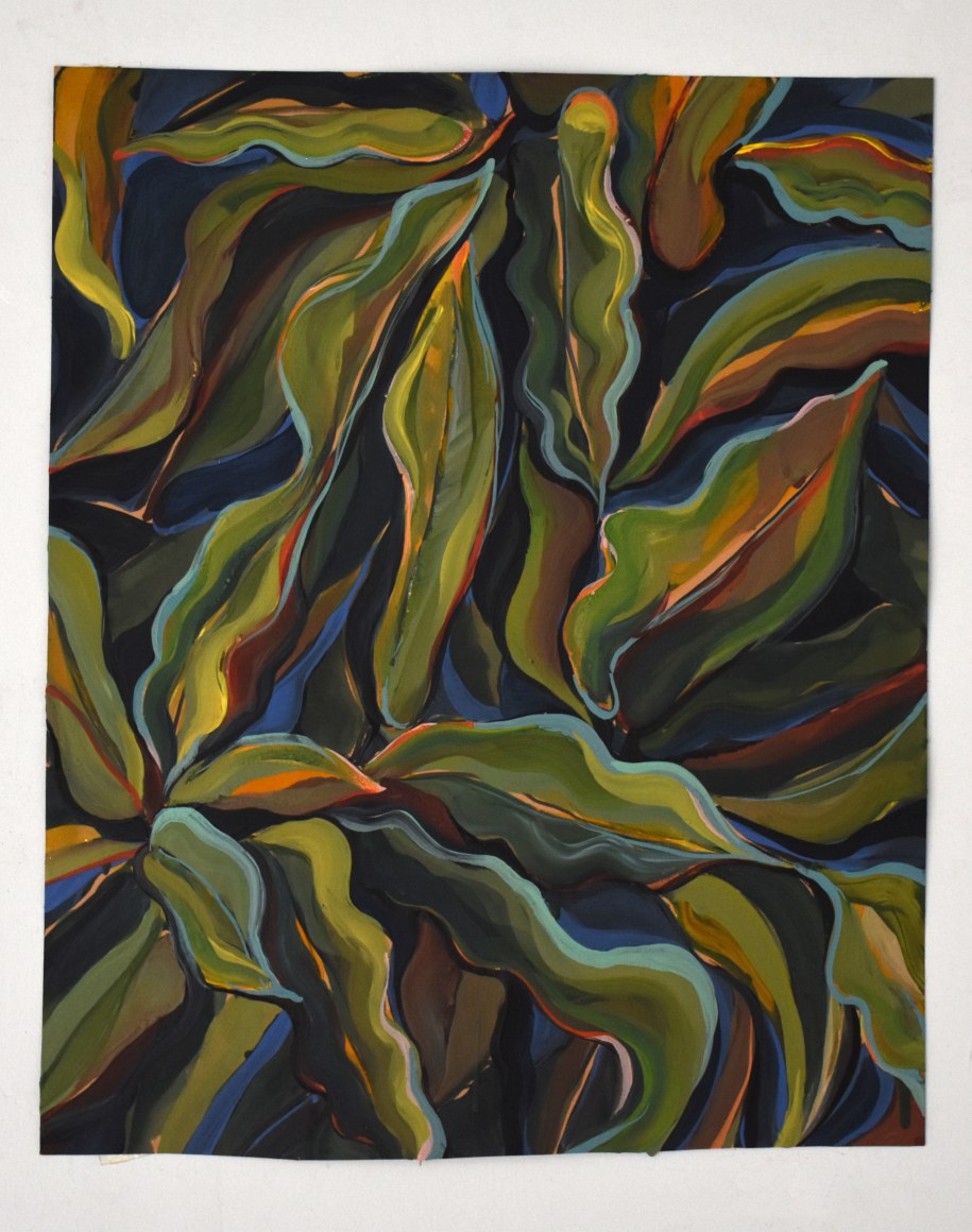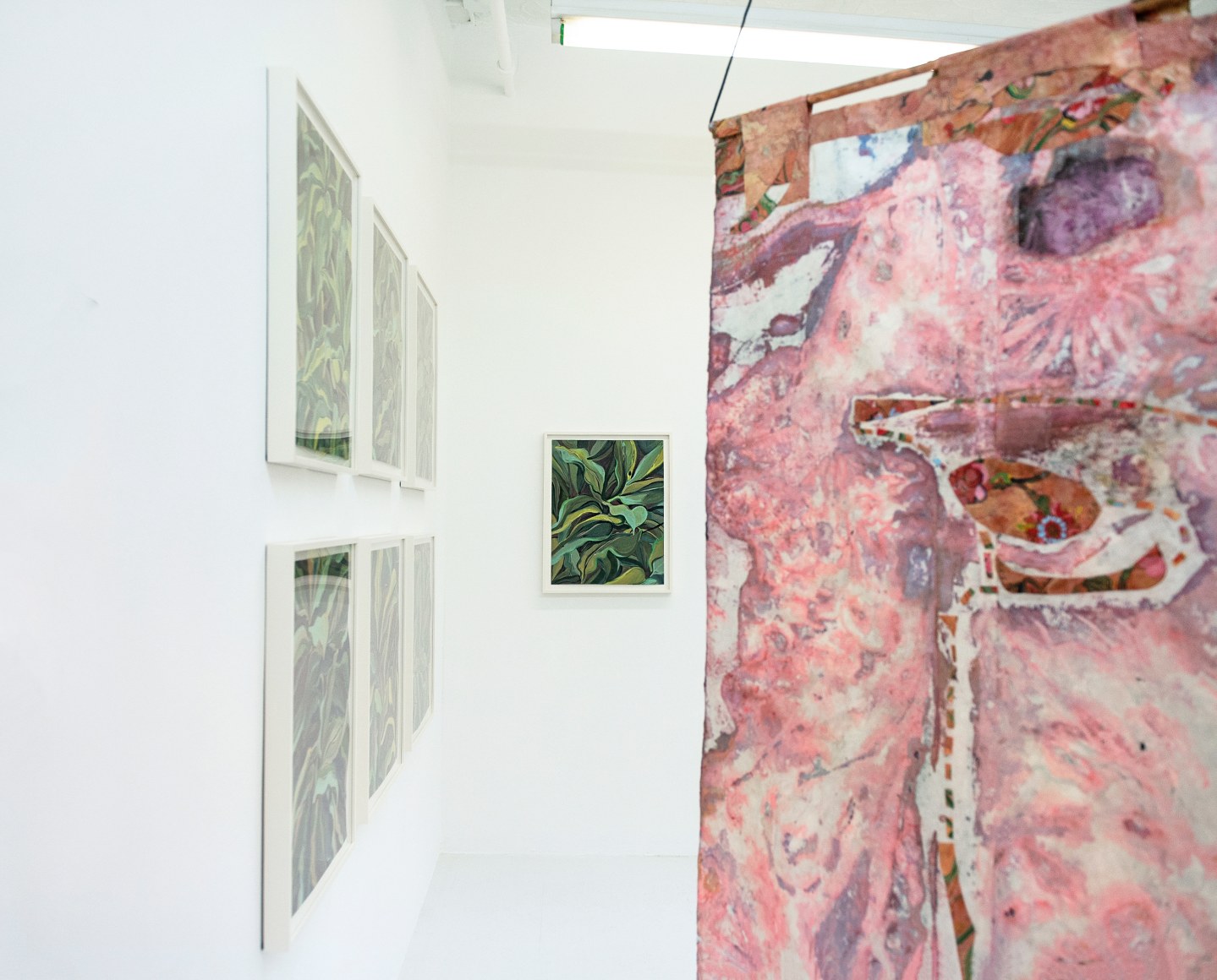 Included in this show are eleven paintings on handmade Bangladeshi Jute paper that present close-cropped views of an old mango tree that lives in Dhaka, Bangladesh. Through the study of personal photographs and her own memory of living with this tree, Hasan presents an abundance of form layered with saturated color, where a sense of environment collapses into healing animated touch. The repeating compositions acknowledge how Hasan engages with memory as a process of the mind, that remembers and imagines simultaneously, where the past is constructed within the present and future.