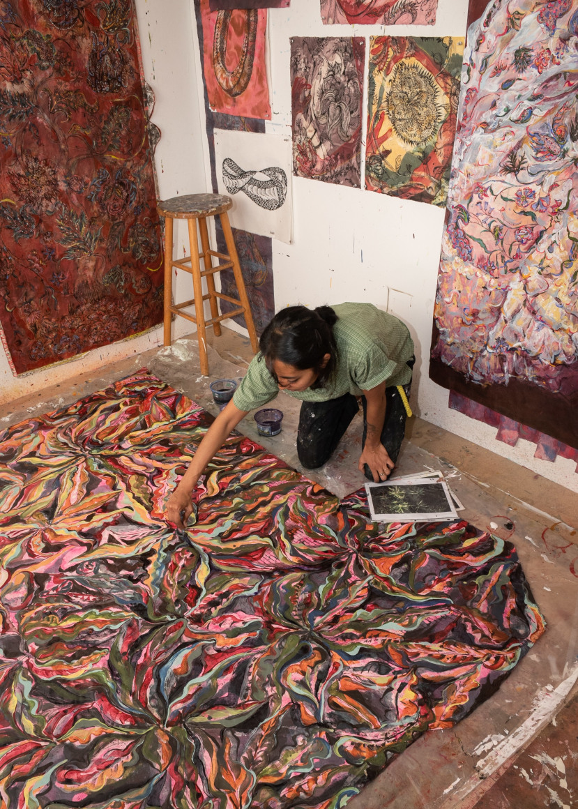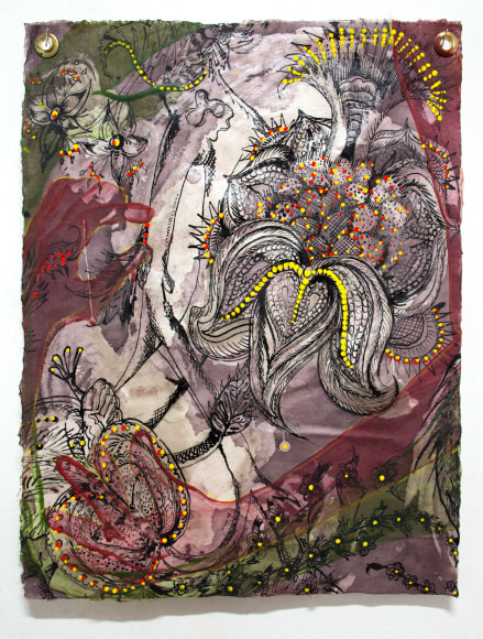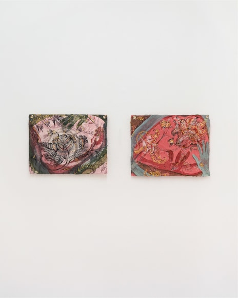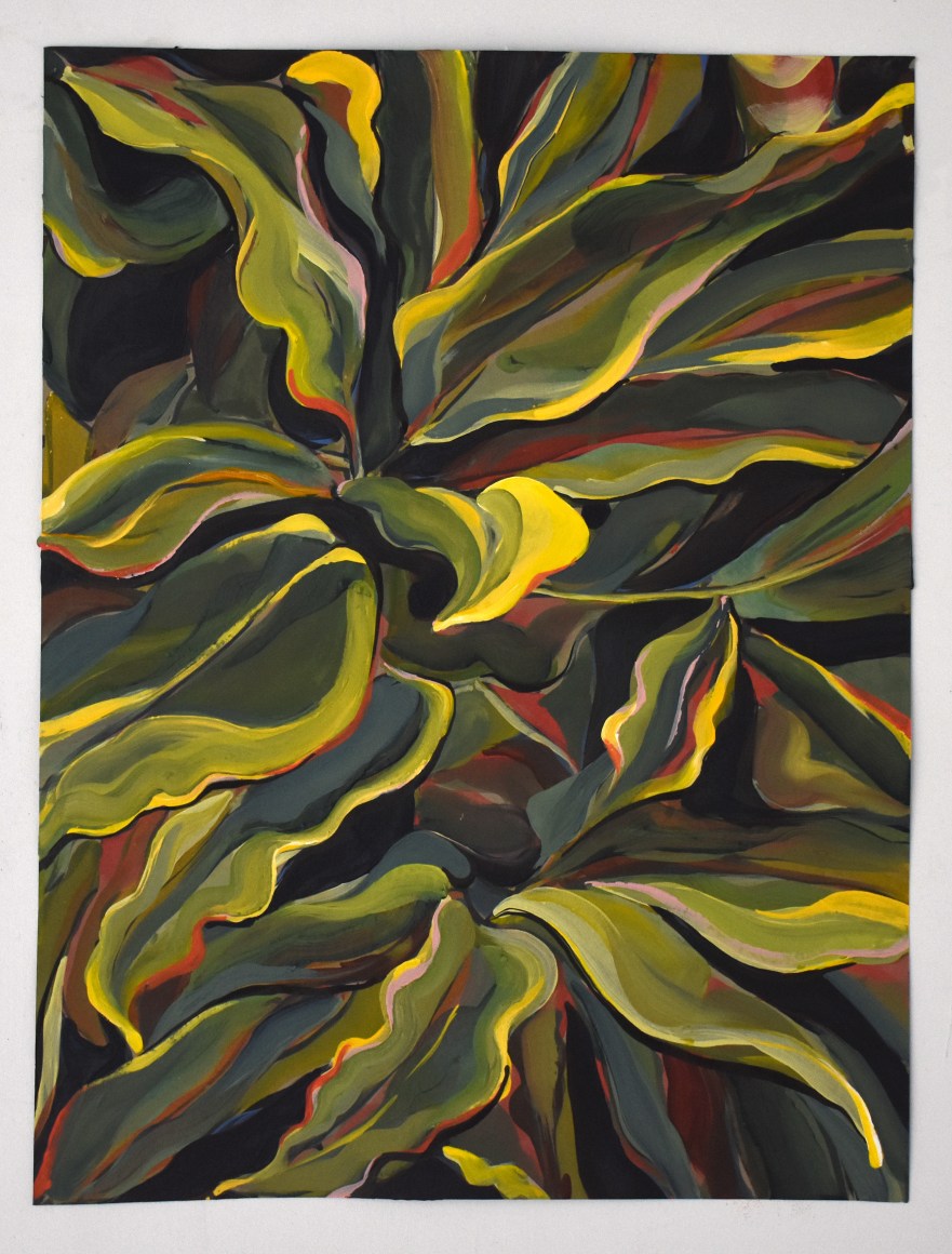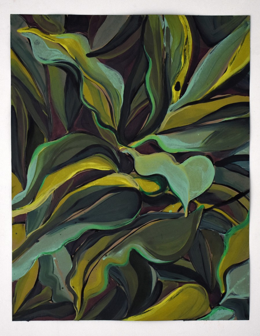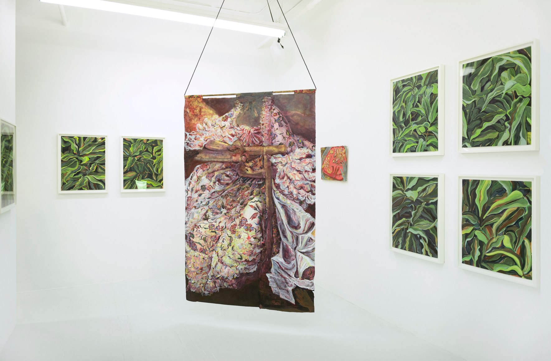 Included in this show are eleven paintings on handmade Bangladeshi Jute paper that present close-cropped views of an old mango tree that lives in Dhaka, Bangladesh. Through the study of personal photographs and her own memory of living with this tree, Hasan presents an abundance of form layered with saturated color, where a sense of environment collapses into healing animated touch. The repeating compositions acknowledge how Hasan engages with memory as a process of the mind, that remembers and imagines simultaneously, where the past is constructed within the present and future.