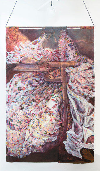 The exhibition’s central piece, The Empress (from Drouais' Madame de Pompadour at her Tambour Frame, 1764), is part of a larger series of hanging paper paintings, where Hasan examines and re-presents European portrait paintings from the 18th c. colonial era. In the portrait paintings that Hasan is drawn to, the person being pictured is adorned with textiles that, to Hasan look to be of South Asian origin. The artist aims to share the way she sees these European paintings, where the textile has equal if not more agency than the person pictured. Hasan centers the textiles as the main characters, reimagining and liberating their voices and bodies beyond the confines of their European representation. The artist draws attention to South Asian textiles to reveal the pervasiveness of colonial impact, as well as the incredibly far-reaching influence of South Asian aesthetics and forms of beauty that are deeply ingrained in all global cultures, perpetually cycling in and out of contemporary fashion.