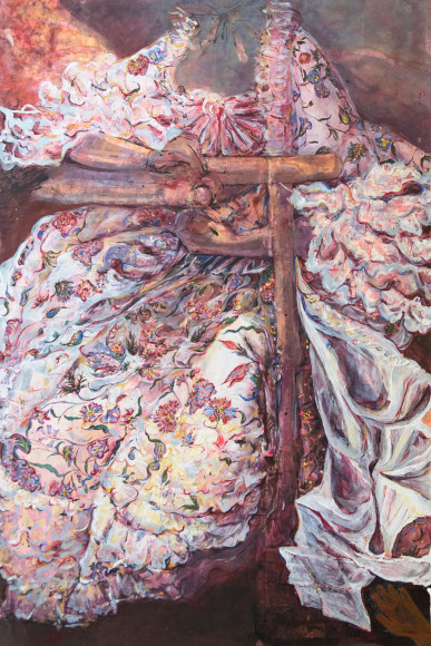 The Empress is a two-sided, hanging painting that seeks to present itself transparently, as simultaneously present, sometimes immersive, and sometimes as thin as a sheet of paper. Hasan’s two-sided paintings have a presentational front and a revealing back that shows their insides: their highly intelligent and all-knowing guts, and the elements that went into their growth. The pieces within this exhibition exist socially and physically in our reality. The Empress’s back includes two photo-transfers, one of a cutout of the knees in Drouais’s portrait of Pompadour, placed instead at her heart, and an early map of a textile town named Mahua Dabar that was destroyed by the British Raj during the Indian Rebellion of 1857.