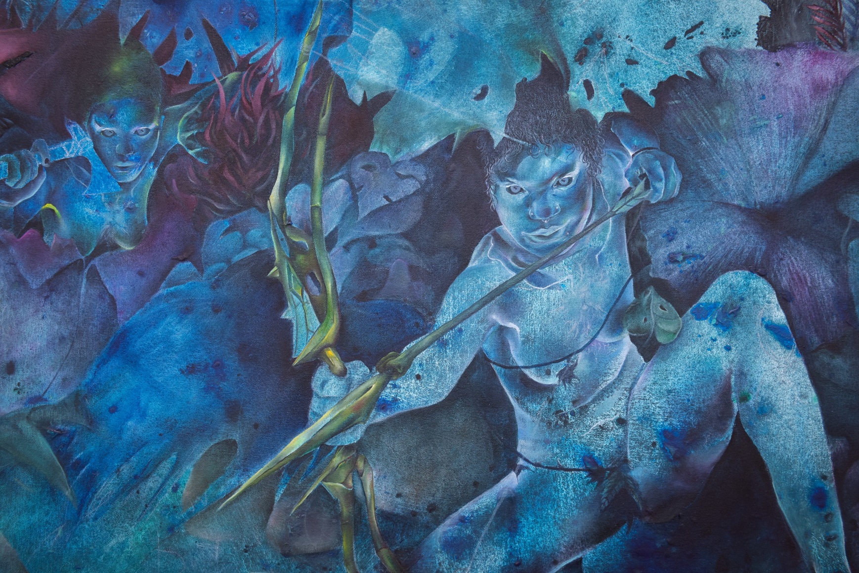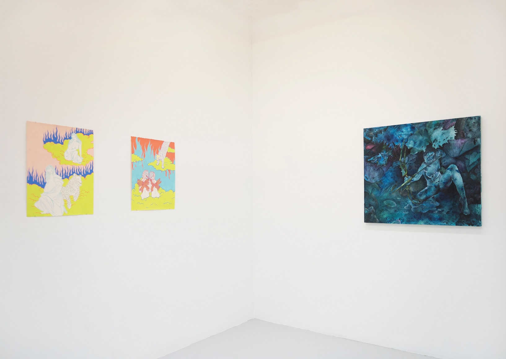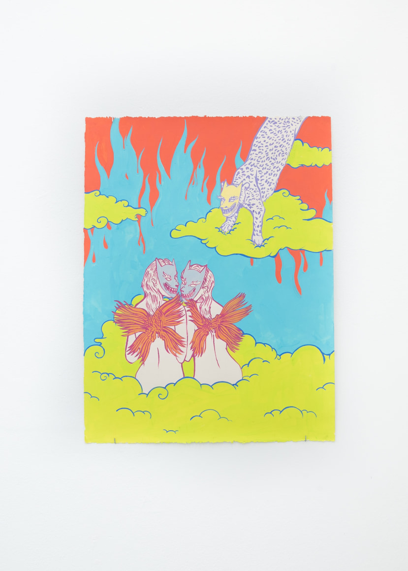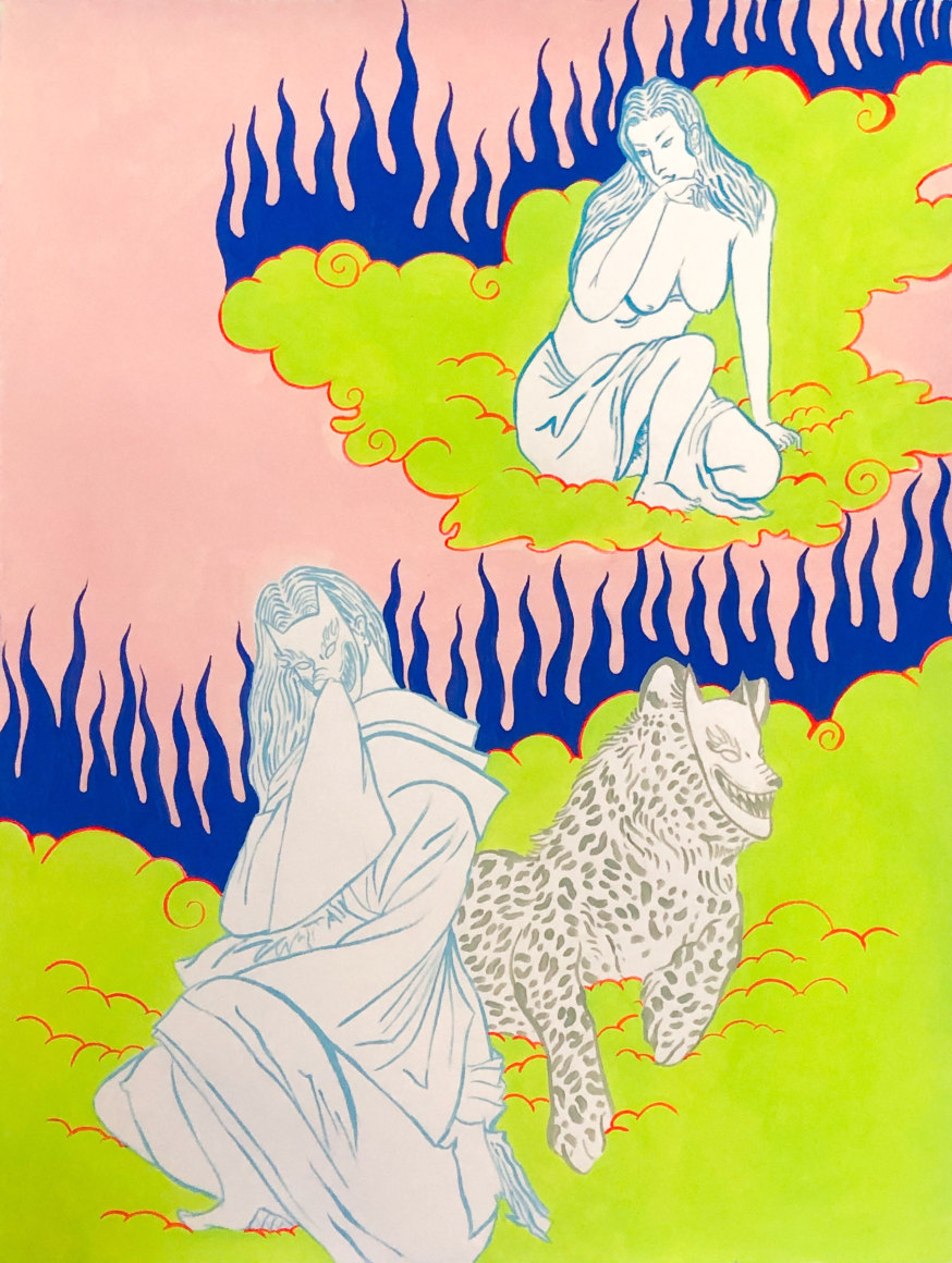 And what exactly does this world look like? Is it one at last void of war, climate crisis, effects of global capitalism, racism, and other means of discrimination? Or are its contents surreal, intended to engage its audience and offer haphazard warning? Within this exhibition, artists have united to demonstrate their shifting realities in a time where fantasy is key, escapism permissible, and reprieve is necessary. The collective aim is to present a more playful and sinister look at the crucial necessity of fiction itself and associated imagery. Through line, color, gesture, and form, viewers are reminded of the power of visual narrative and the importance of reverie.