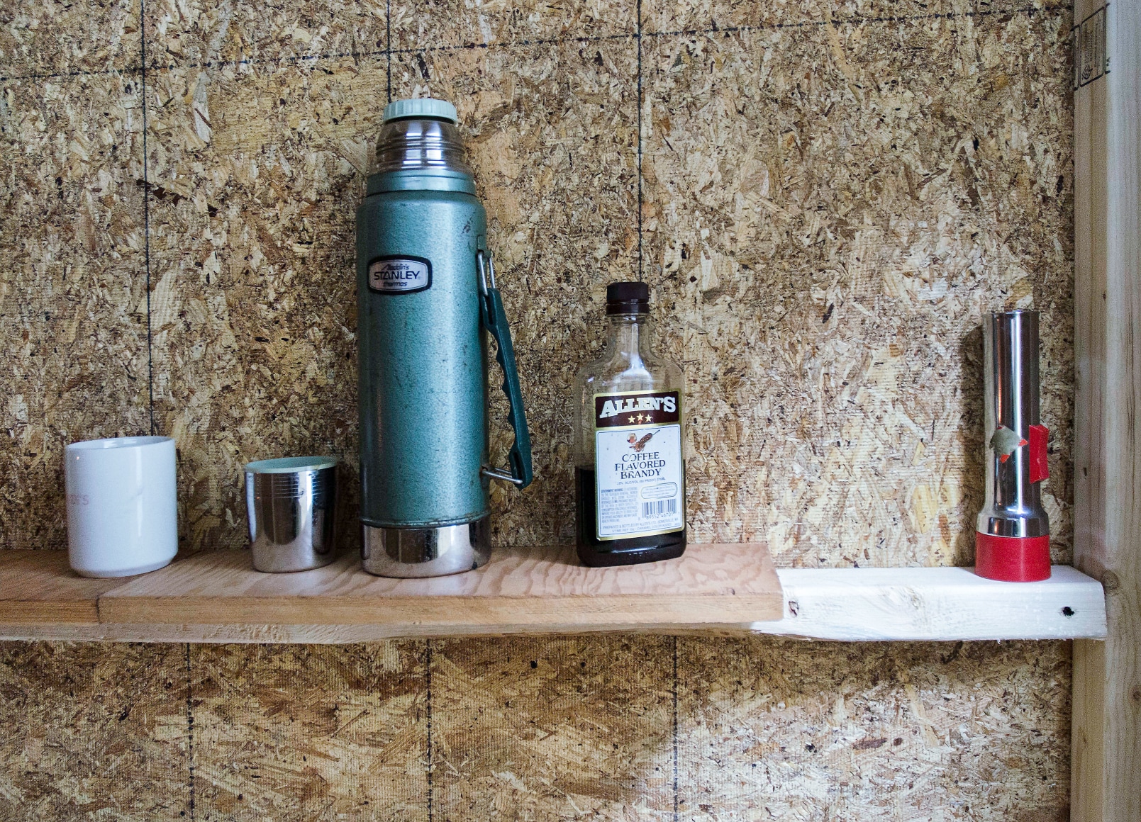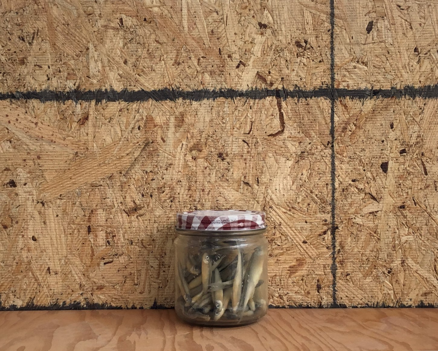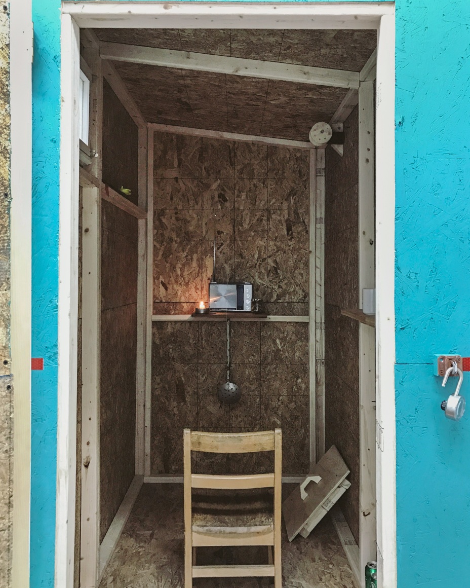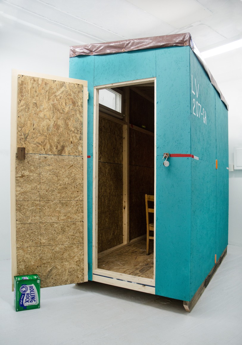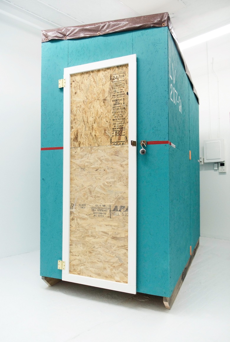 Flags Down continues Lafreniere's practice of transforming a space into the tangible mannerisms of a contemplative dialogue on masculinity and its ritualistic cultural identity. In essence, his installations have the connotation of time capsules. Here Lafreniere hones in on the personal and social liturgy of ice fishing. This work considers its tradition of self imposed isolation and retreat. As in several of Lafreniere's previous installations, he highlights the subjects masculine space, drawing our attention to its subtle complexities, and allowing its relationship to hermitage to be noted both artistically and in observance.