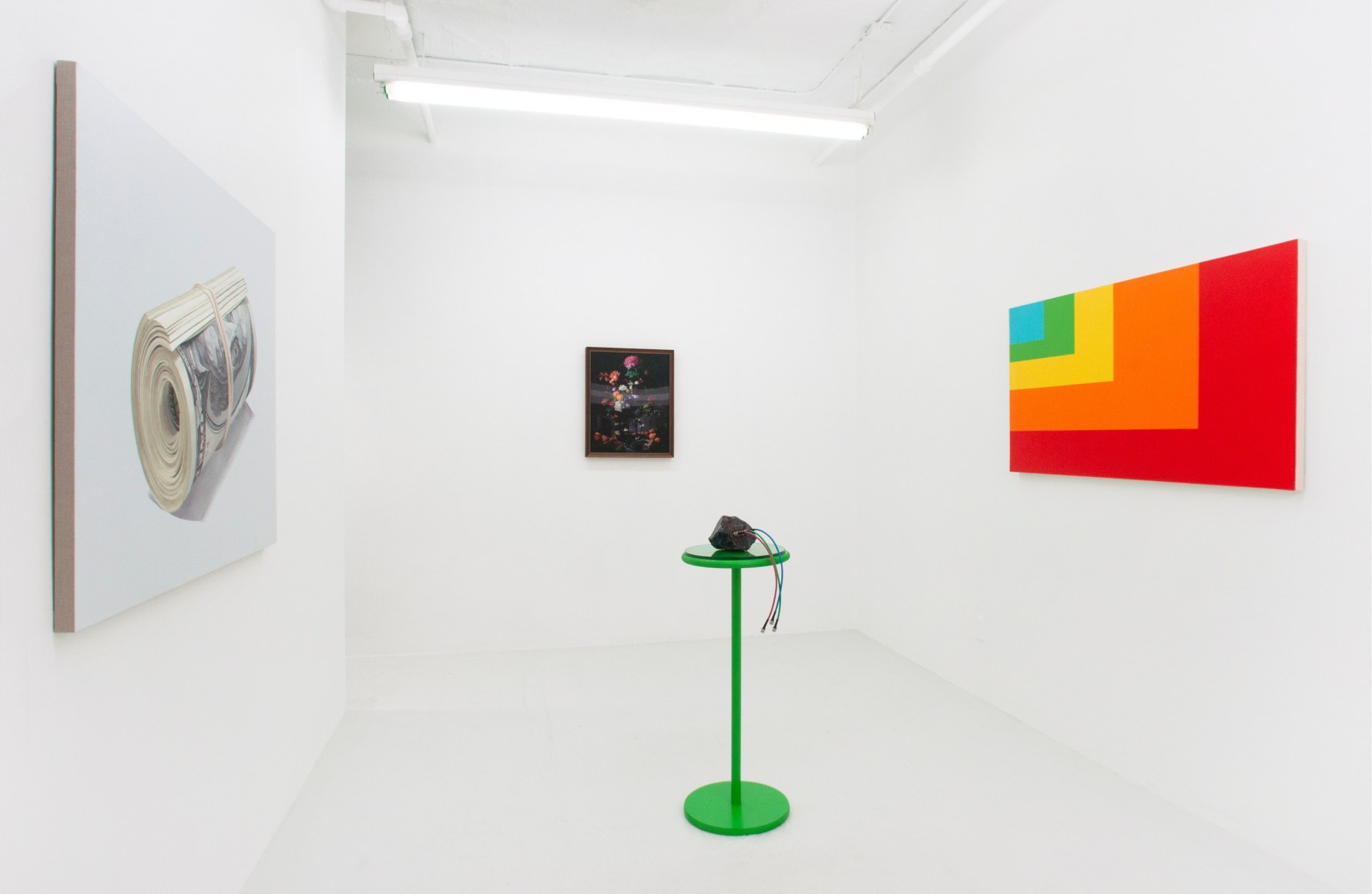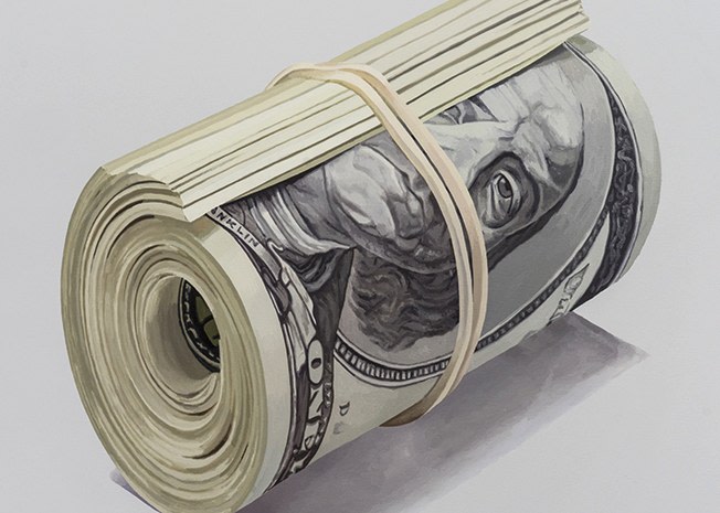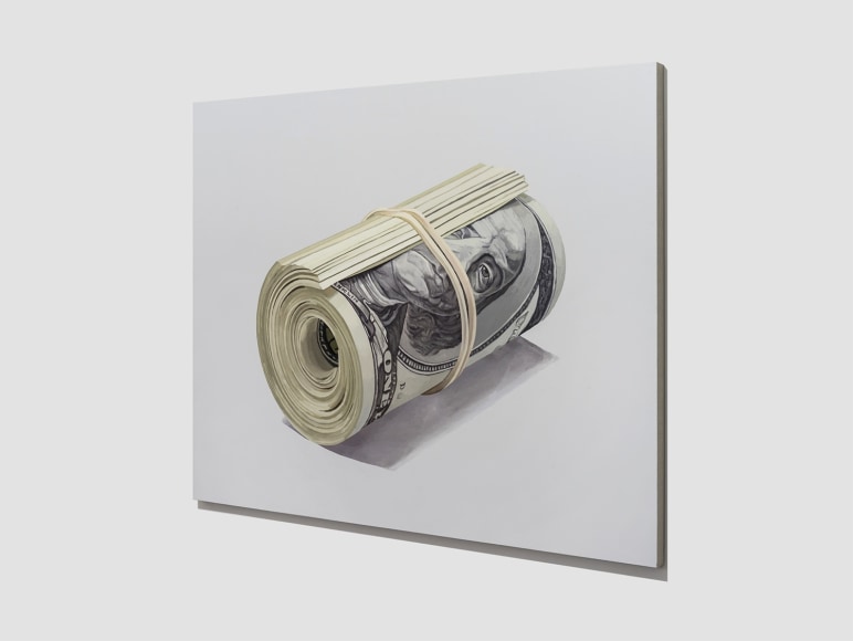 Through technology, Davidson has built a platform, which captures a macro-observation of life driven by digital media. Amongst the regular inundation of images, information, media and news, he plays with this duality of worlds by creating the architecture of connecting the physical with the non-physical or technological. Behind pieces such as 4K, 2018, a hyper-realist painting of a roll of US 100-dollar bills, Davidson directly bridges painting, the human hand, and the transfer of a fixed image to another medium. By doing so, this process parallels the augmentation of our current reality, unlocking the ability to live within a multidimensional world.