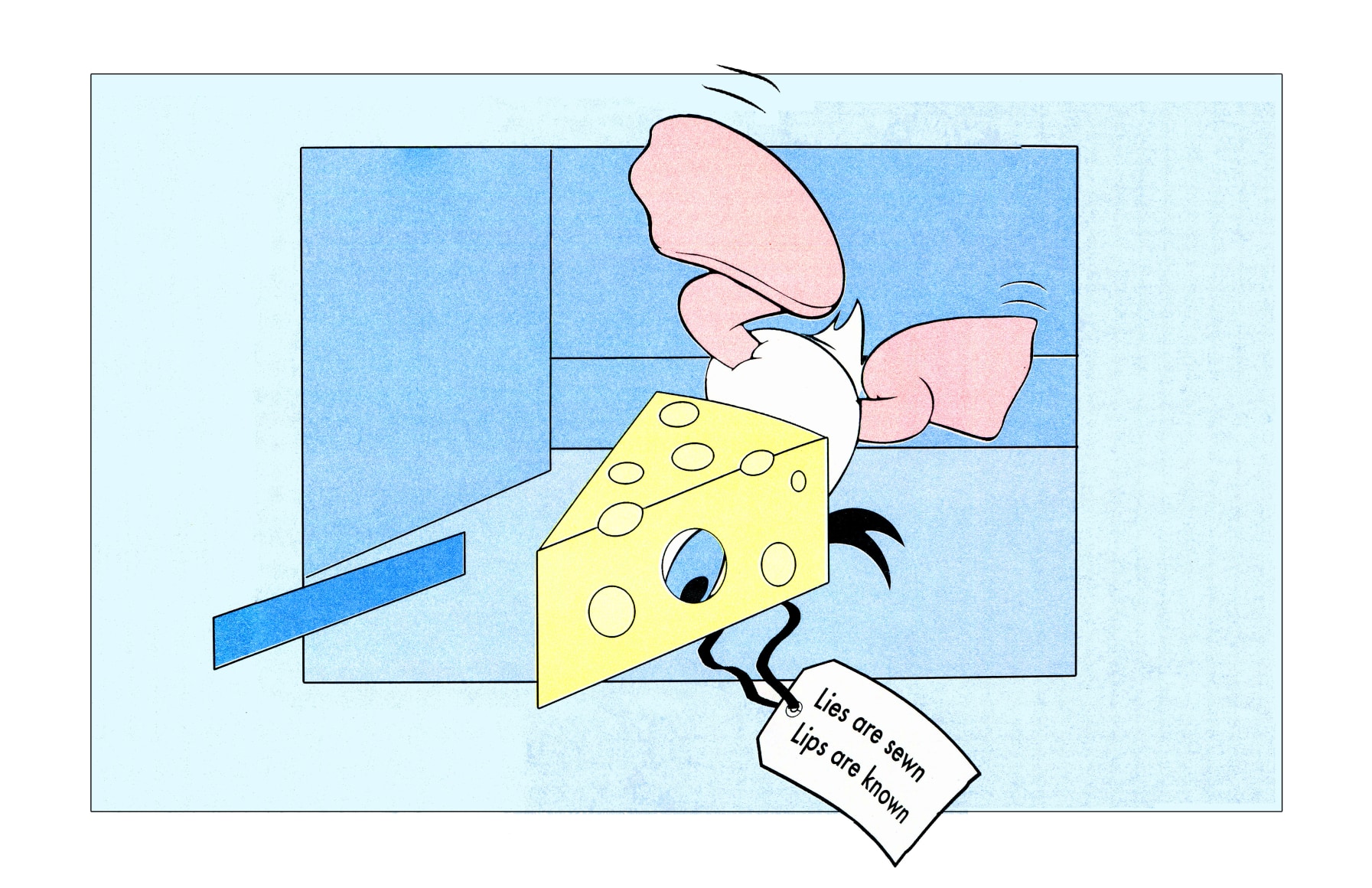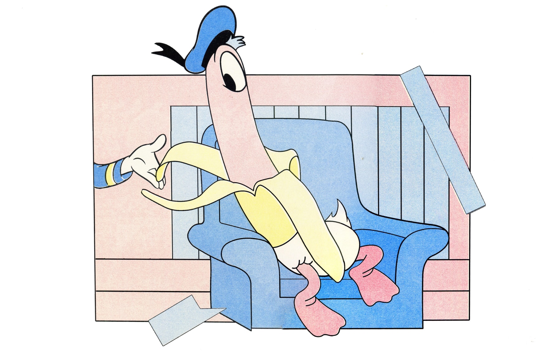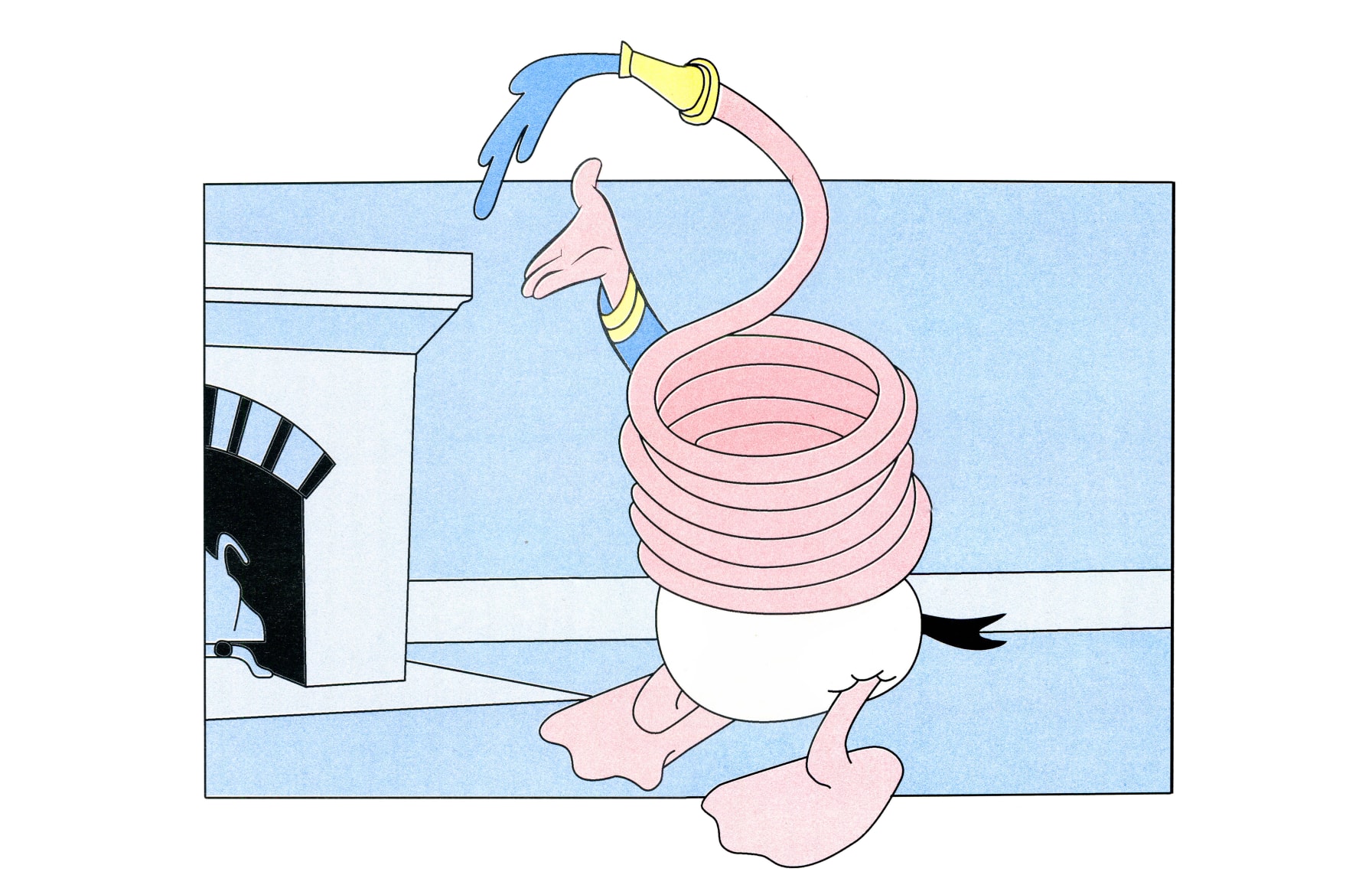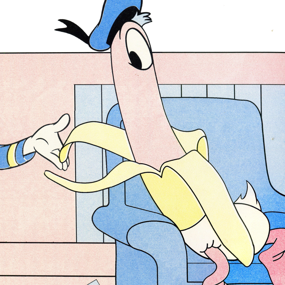 Lies are Sewn, Lips are Known is the addendum to the artist’s previous viewing room Moiré Vowing. These new works consist of risograph-printed versions of four of the twenty featured previous works. Willingham transferred the previous iteration’s physical line drawings into digital vectors and then colored them into a muted flat pop aesthetic. The resulting compositions continue to appropriate the bottom half of Donald Duck bred/forced together with an array of disparate image. These prints tell the story of novel characters who inhabit the original domestic spaces of those characters before them, while further accumulating references of the cartoons that they were originally taken from—eyes, hats and hands.