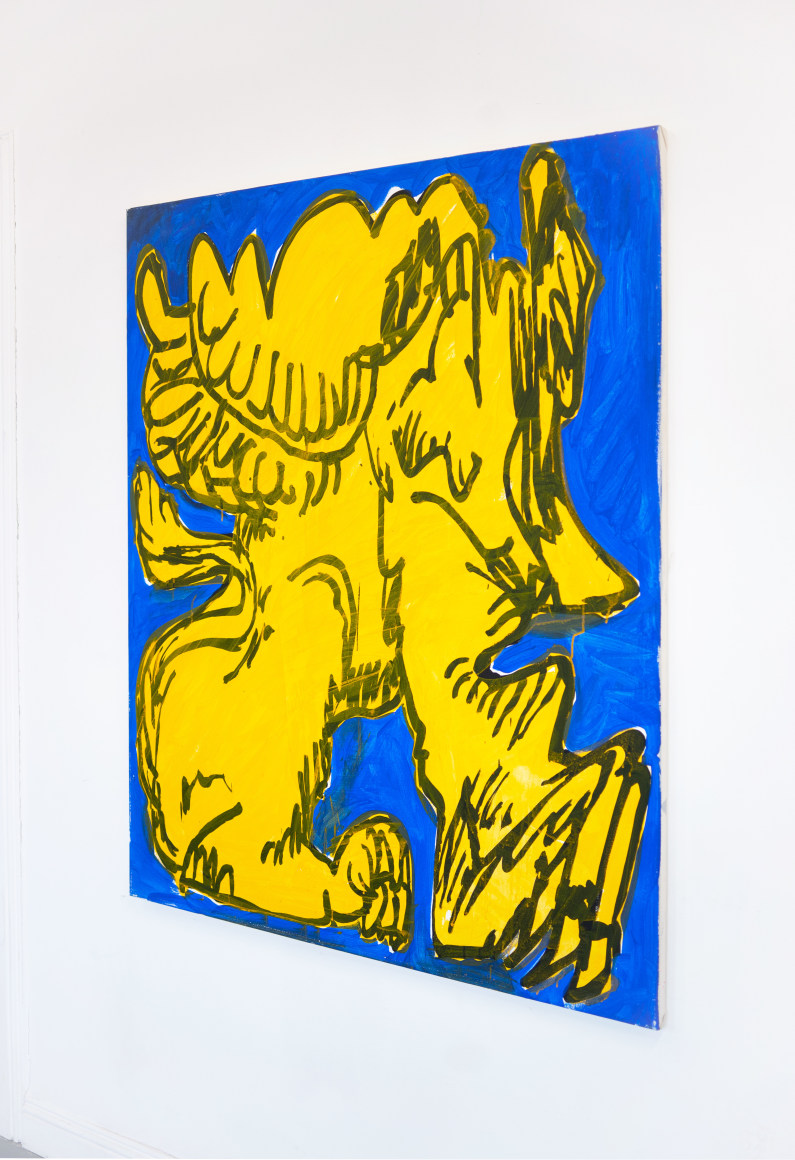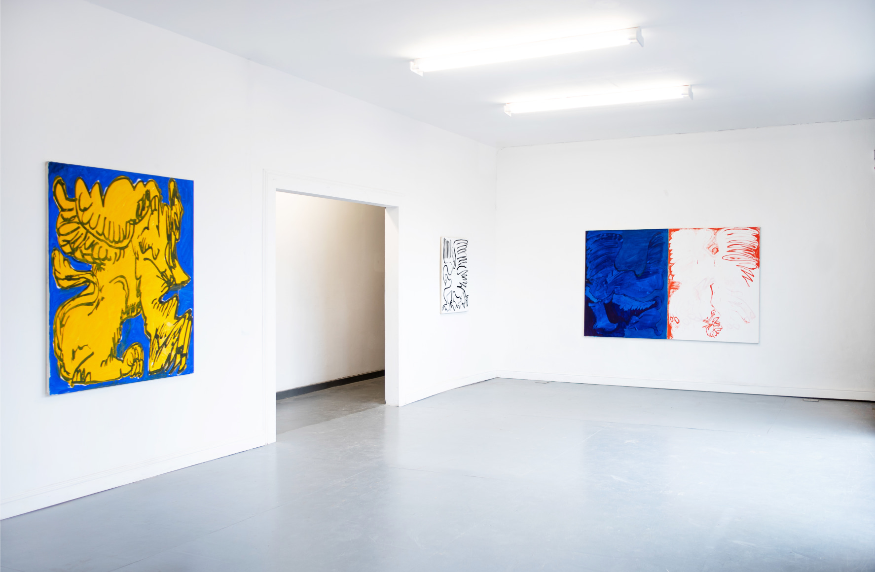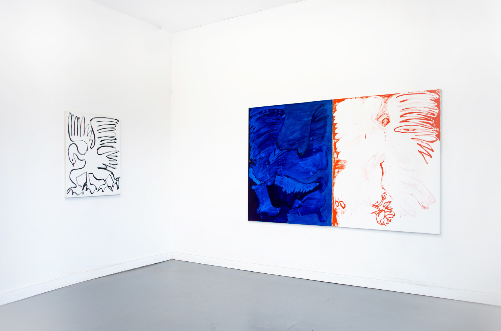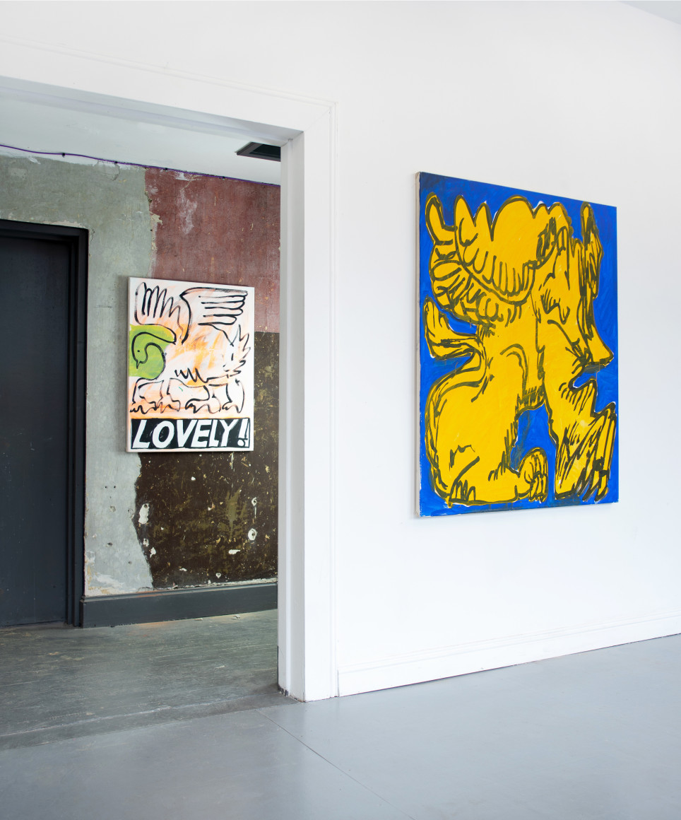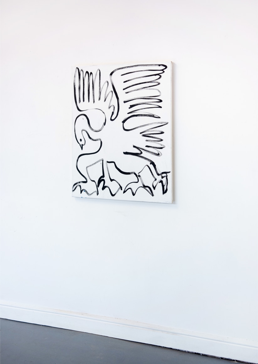 Hurlock symbolically disrupts the conventional display within a gallery through his extension into the hallway, framing his work among the deconstructed architecture of the space. Scrawled below the naïve depiction of a swan, a sardonic “lovely” sets the tone of the exhibition. Confined by the borders of their canvas, heraldic beasts adorn the walls of the gallery revealing and obscuring forms through their application of paint. At the core of these paintings, lies a discussion about the impact of these symbols, and what they signify to our culture and history today.