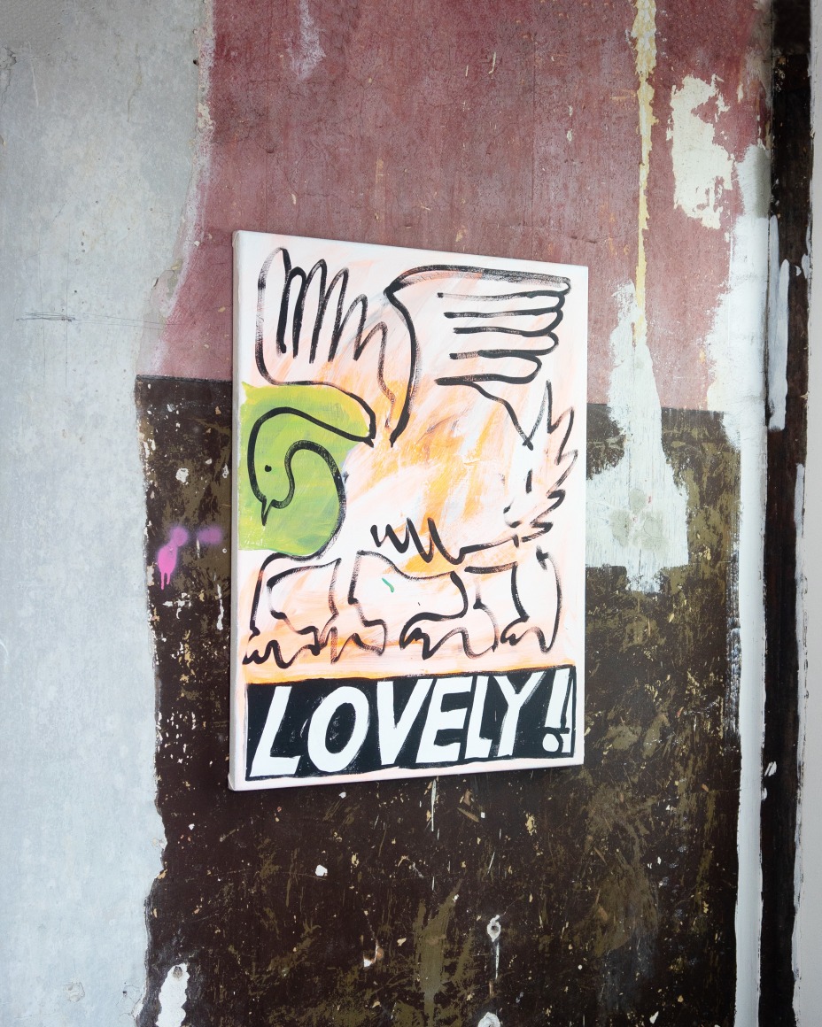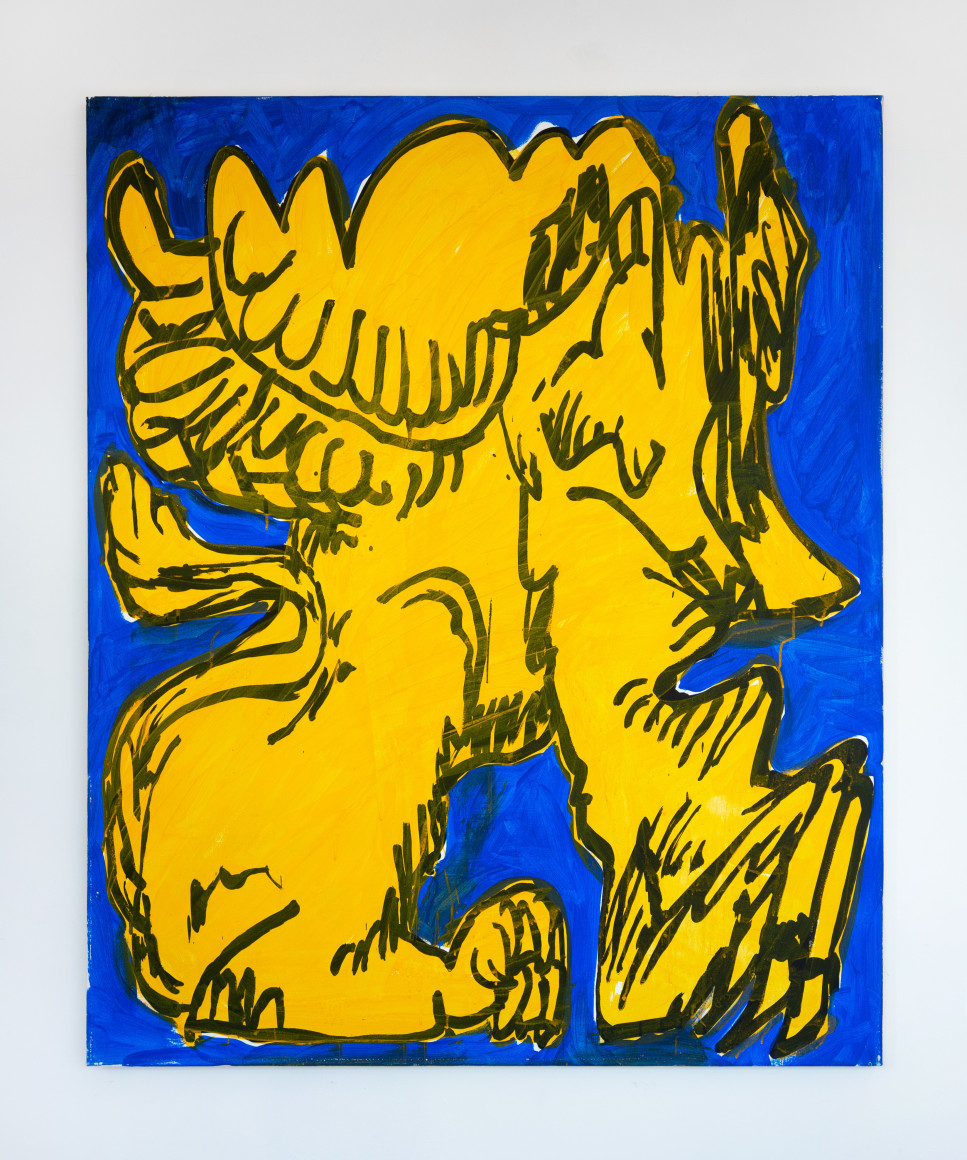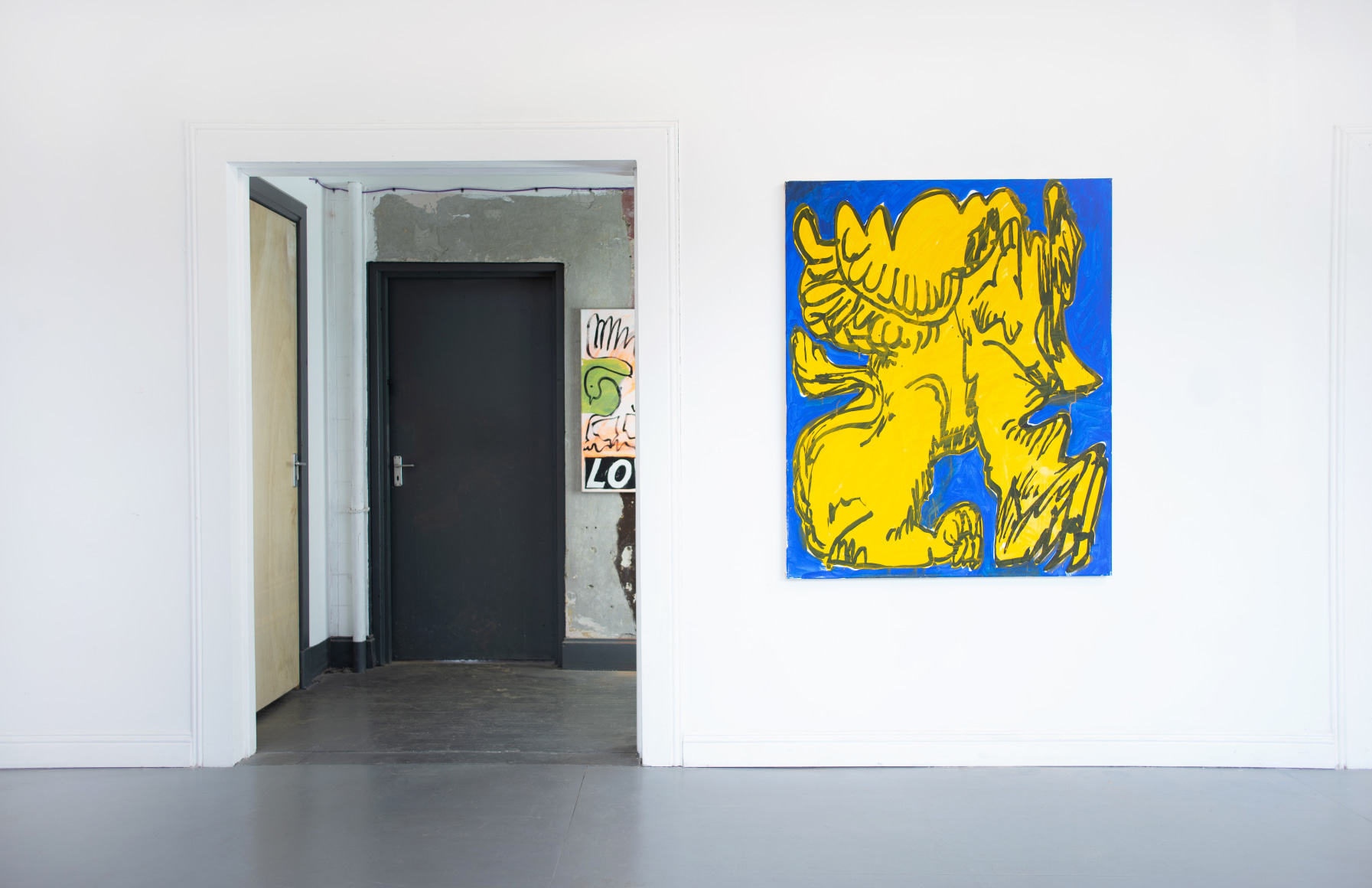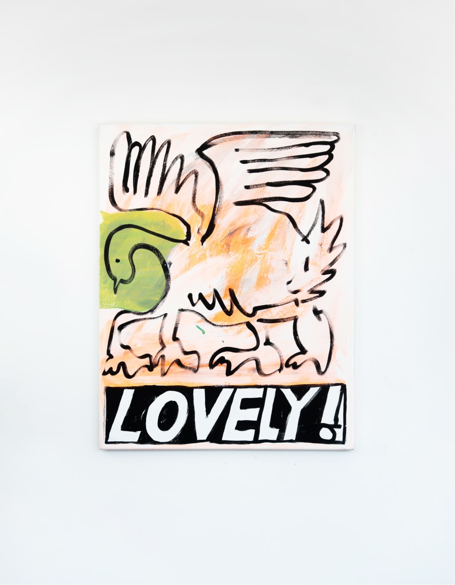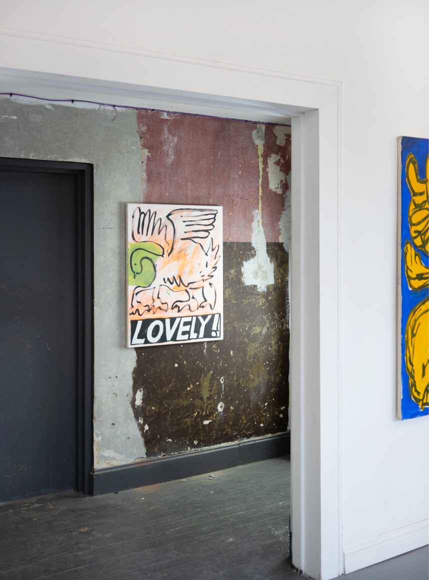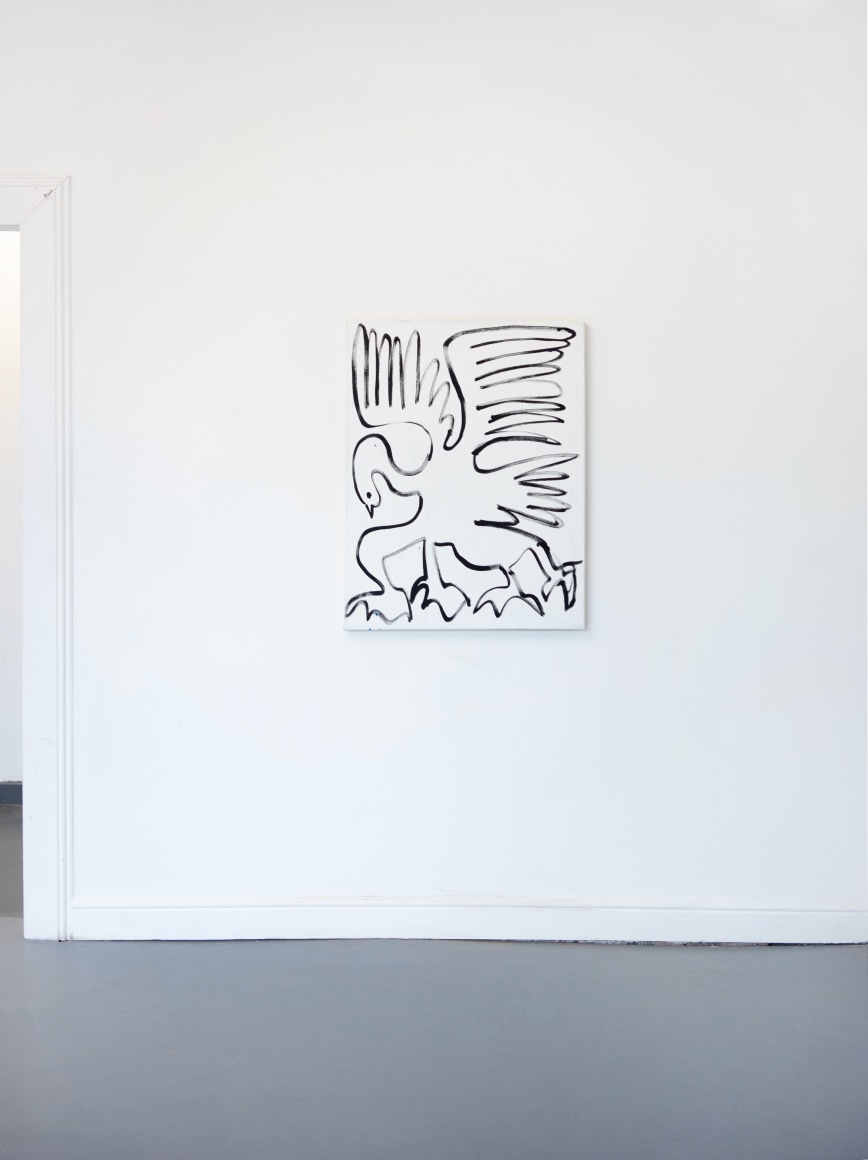 Hurlock symbolically disrupts the conventional display within a gallery through his extension into the hallway, framing his work among the deconstructed architecture of the space. Scrawled below the naïve depiction of a swan, a sardonic “lovely” sets the tone of the exhibition. Confined by the borders of their canvas, heraldic beasts adorn the walls of the gallery revealing and obscuring forms through their application of paint. At the core of these paintings, lies a discussion about the impact of these symbols, and what they signify to our culture and history today.