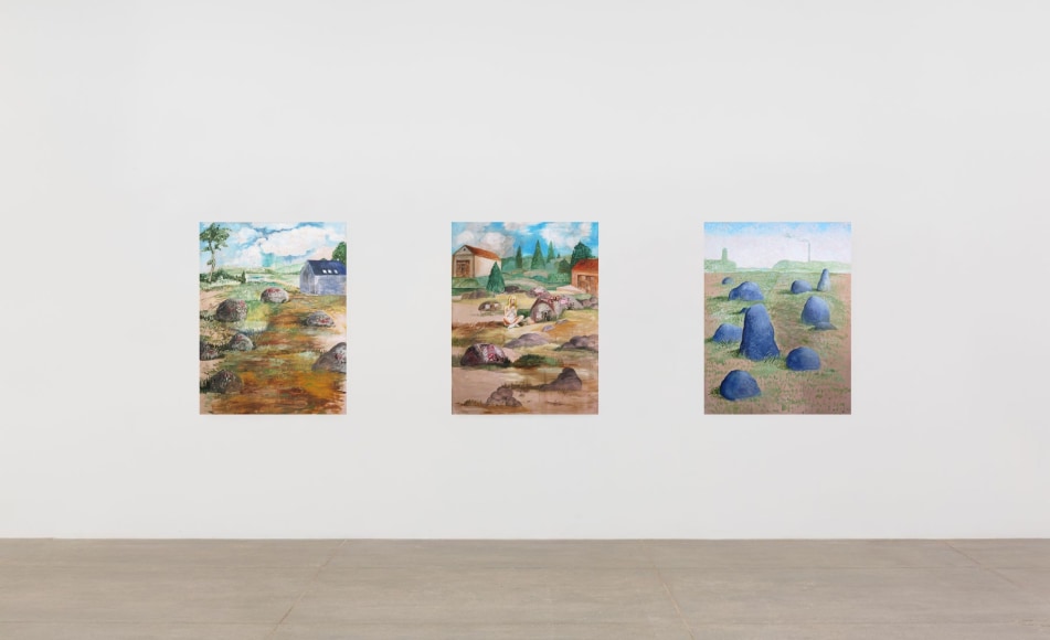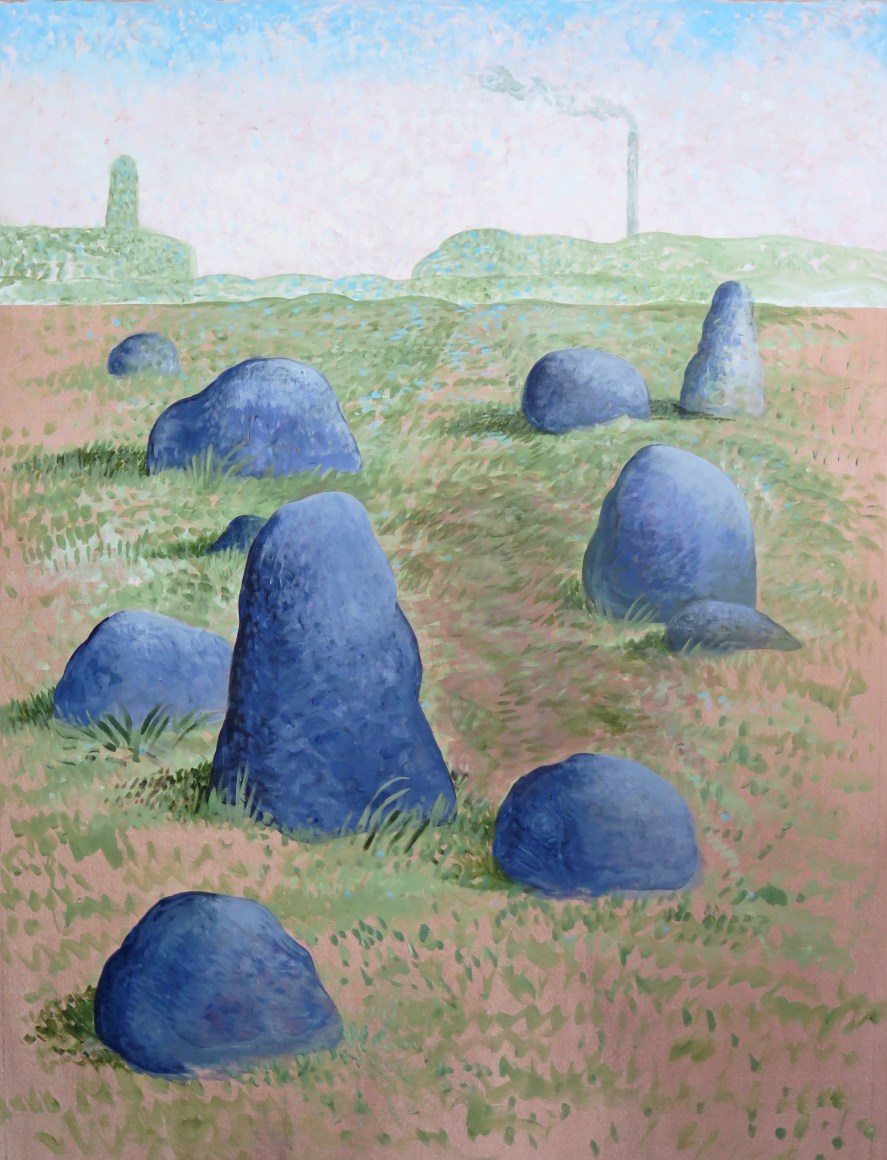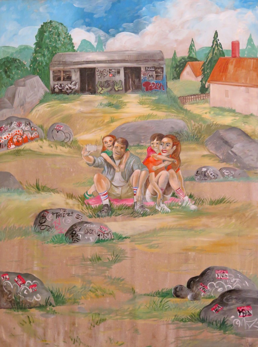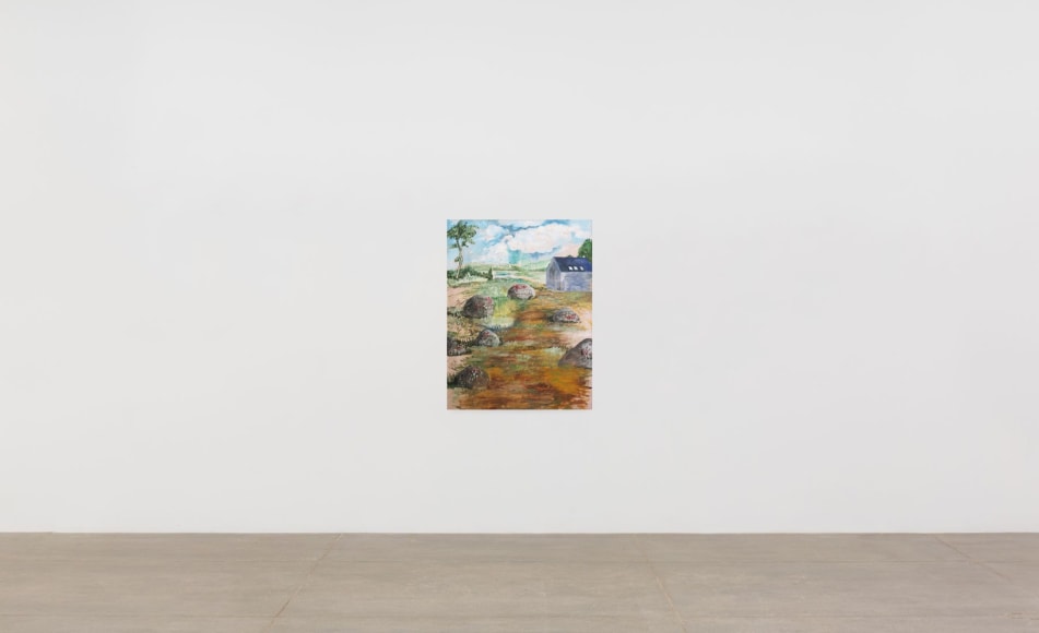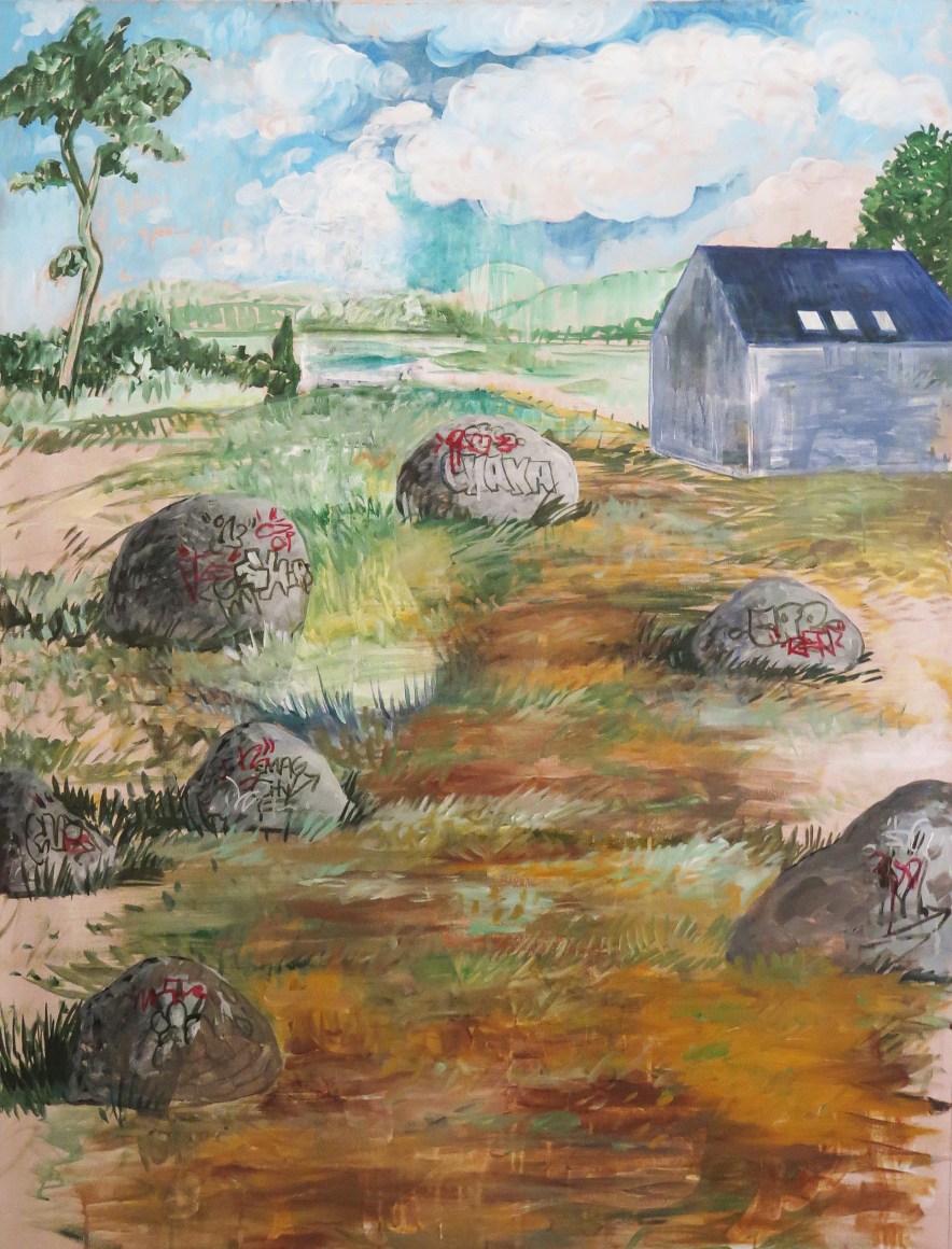 In this new series of paintings, the artist returns to a familiar subject, the landscape. Using these natural elements as the backdrop for these new works, pieces such as Landscape Near Industrial Area, or Landscape With House collectively place at face value both the natural beauty, and man-made chaos conducted within it. From graffiti on rocks, to industrial buildings and smoke stacks, to a simple garage on a hillside, Becker seeks to capture not merely the pleasure within the sometimes deserted landscape, but the satire as well.